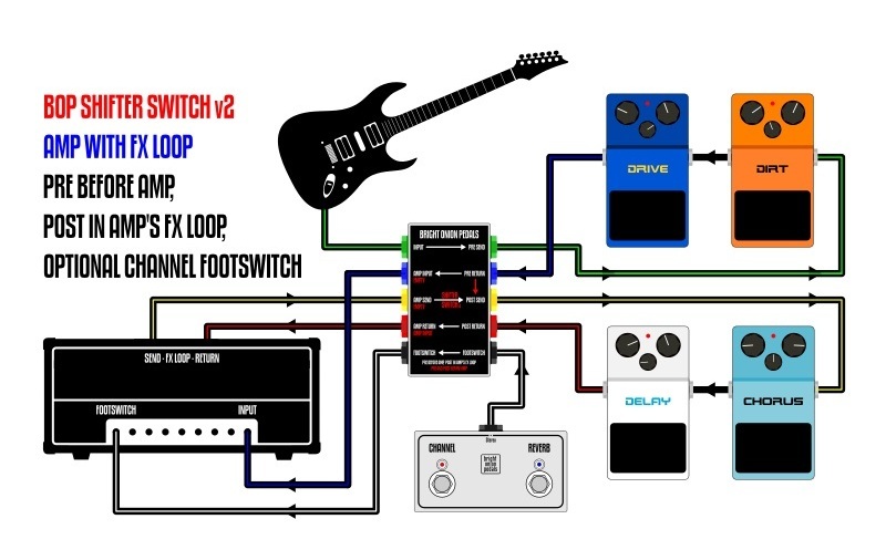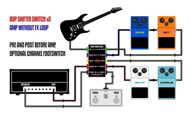 החיבור ל-Shifter Switch בצד של הפדאלים נשאר קבוע. כל מה שנותר לכם לעשות הוא לחבר את הכבלים במגבר לפי הכיתוב על הפדאל בהתאם למגבר בו אתם משתמשים, עם FX Loop או בלי.