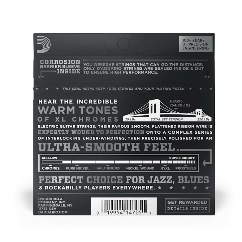 מיתרי ה-Flat Wound העשויים מ-Chrome של D’addario הם לא סתם פופולריים במיוחד אצל נגני ג’אז ואפילו בלוז (כמו גארי קלארק ג’וניור) – הם מוציאים את הסאונד הכי חם, חלק ונעים שמיתרים יכולים להציע! הליפוף השטוח גםעוזר להפטר מרעשים וחריקות של אצבעות שזזות על המיתר.