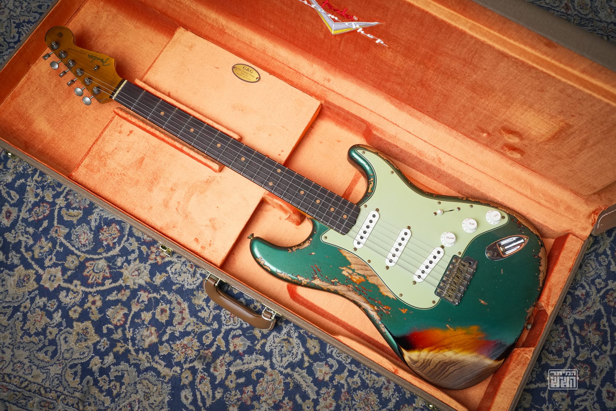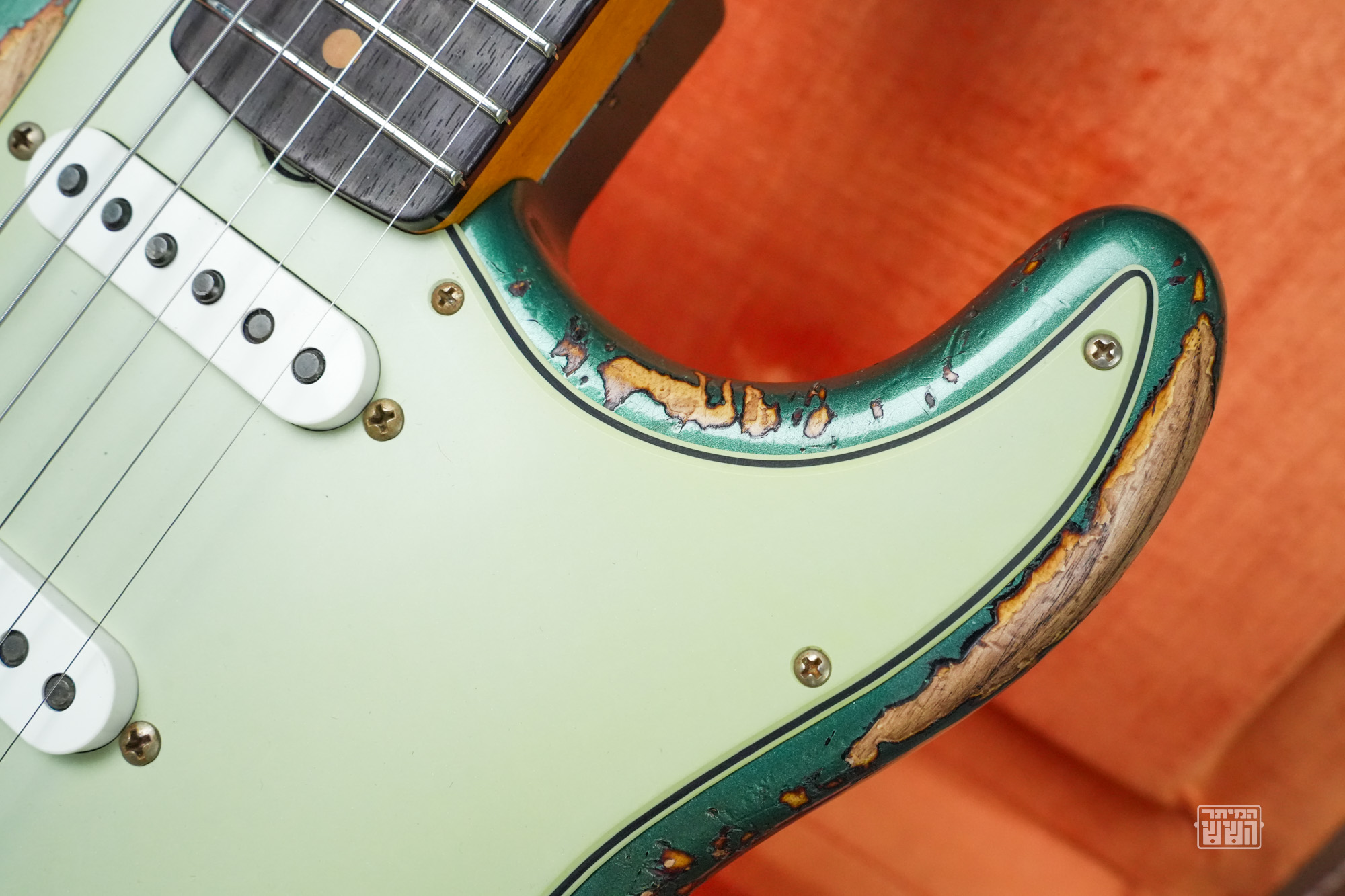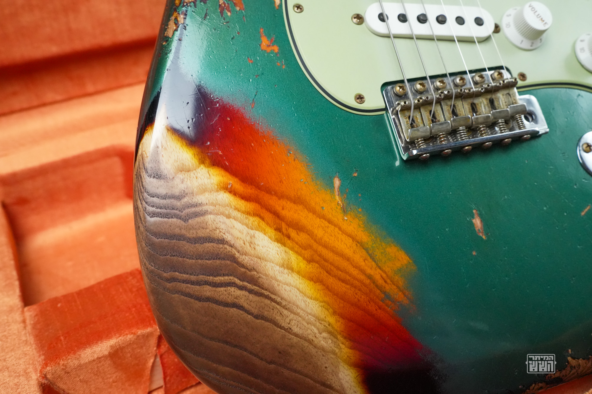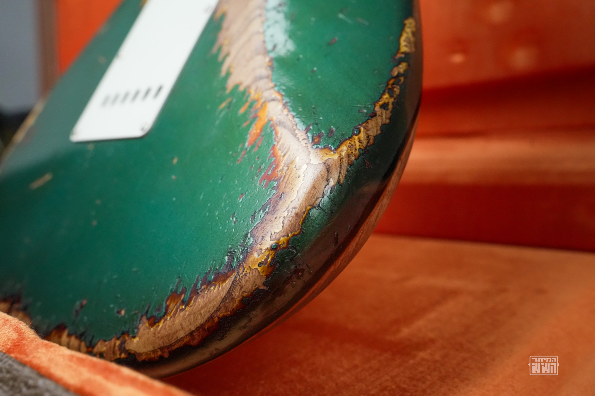 הסטראט הזו היא ראישיו 61 עם גימור ירוק שרווד מטאלי -אחד מגימורי הקאסטום המיוחדים שפנדר הציעו בזמנו – צבוע על גביי סאנברסט (צבע על צבע).
