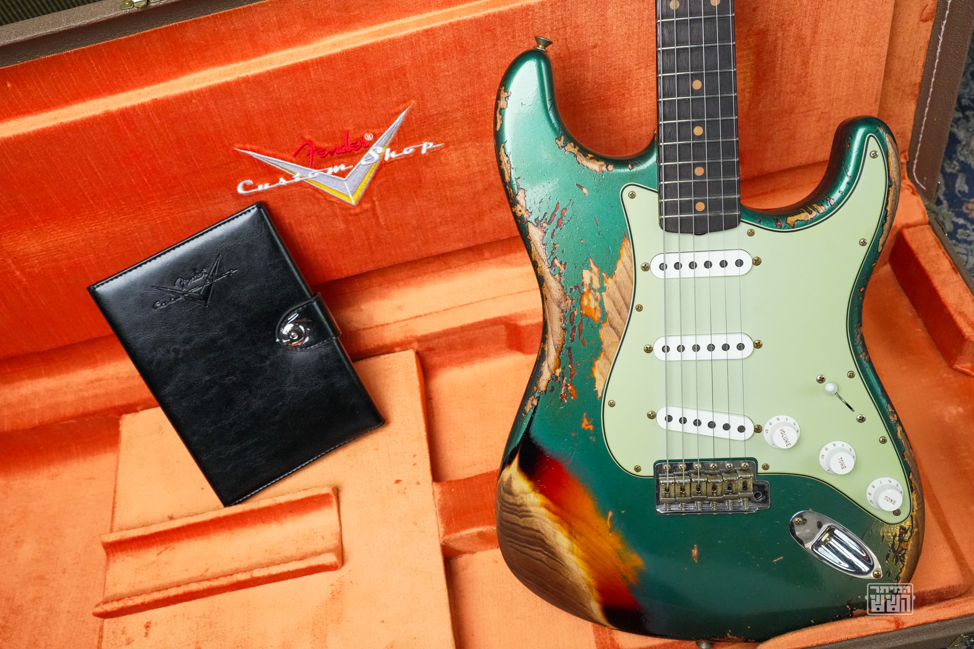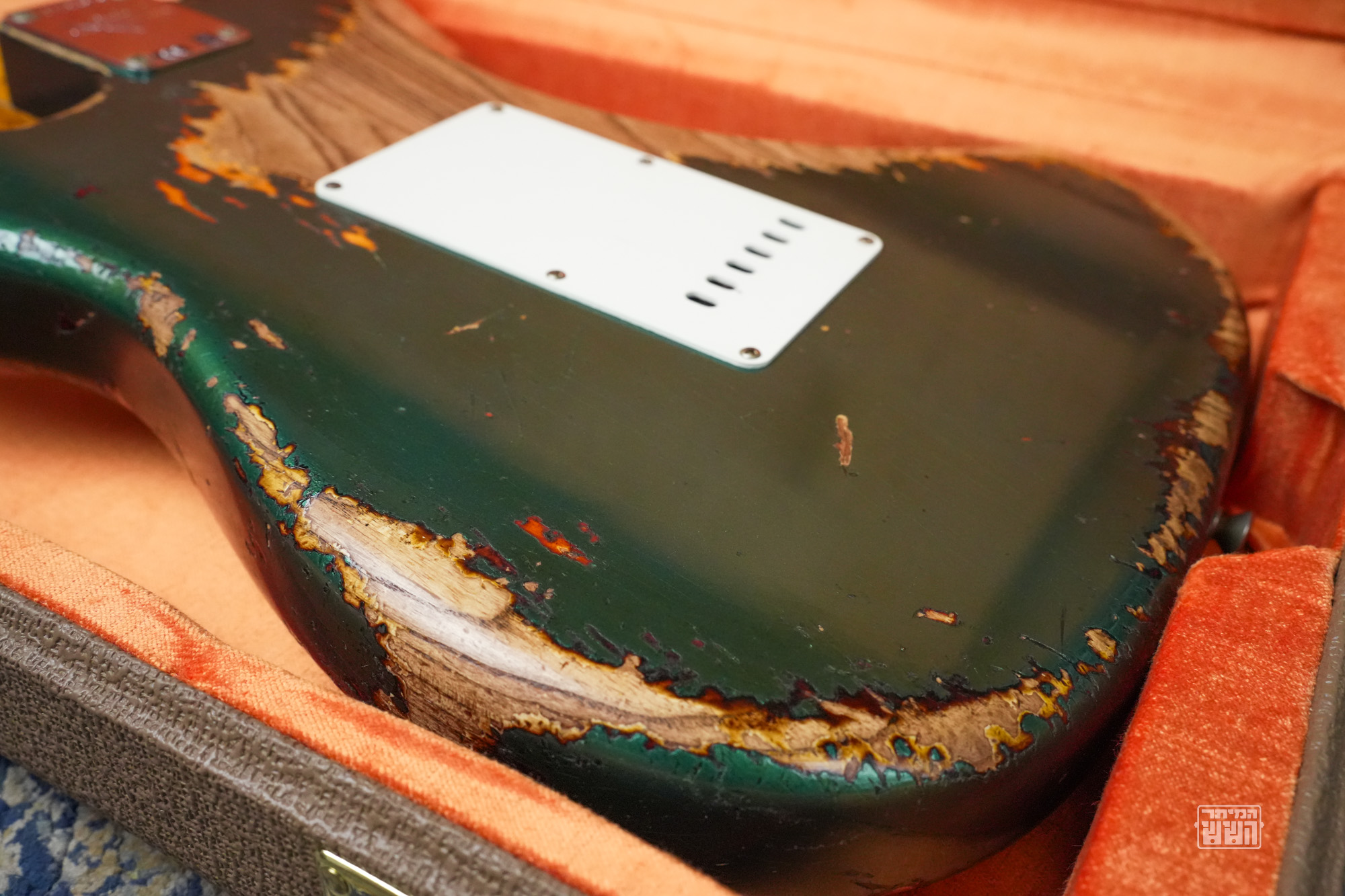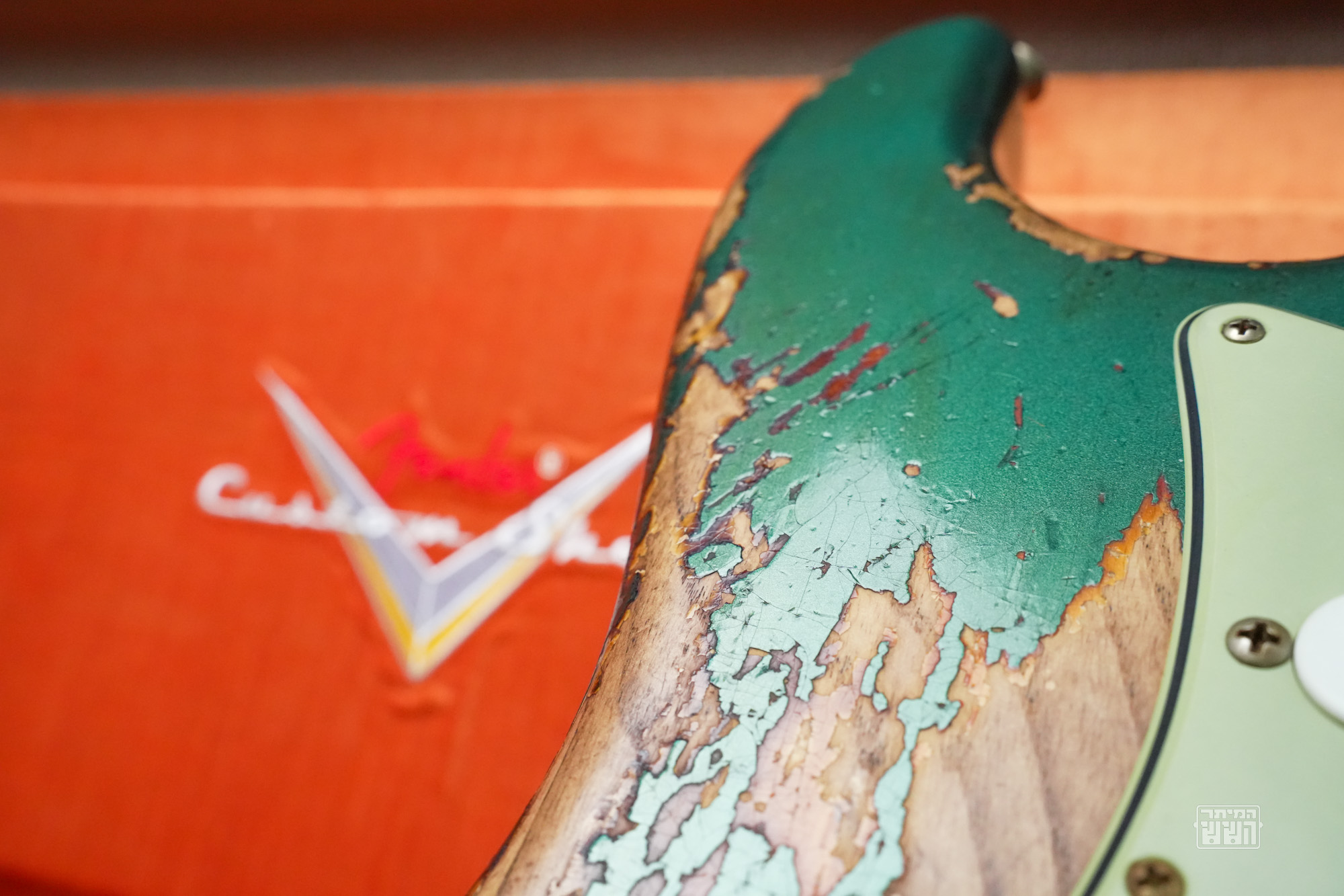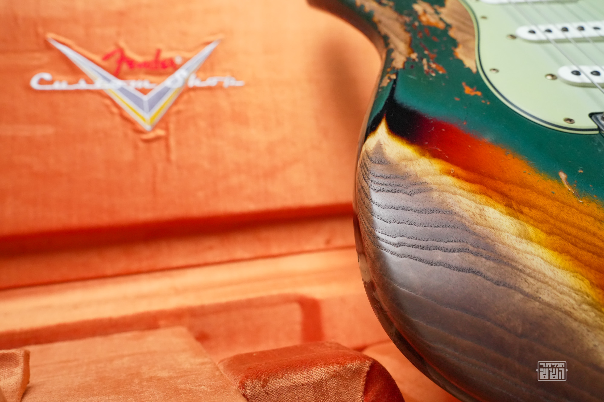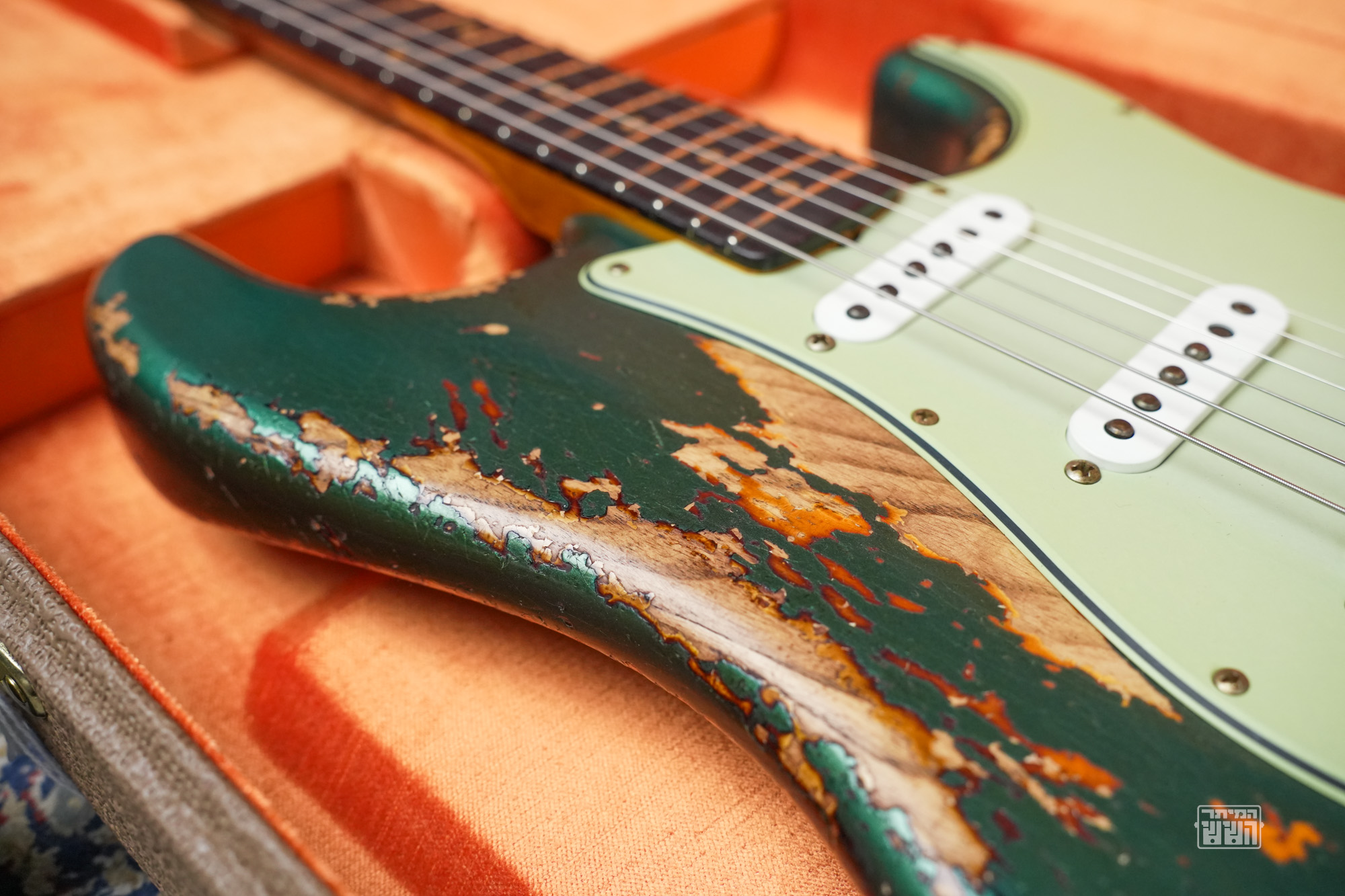 הסטראט הזו היא ראישיו 61 עם גימור ירוק שרווד מטאלי -אחד מגימורי הקאסטום המיוחדים שפנדר הציעו בזמנו – צבוע על גביי סאנברסט (צבע על צבע).
