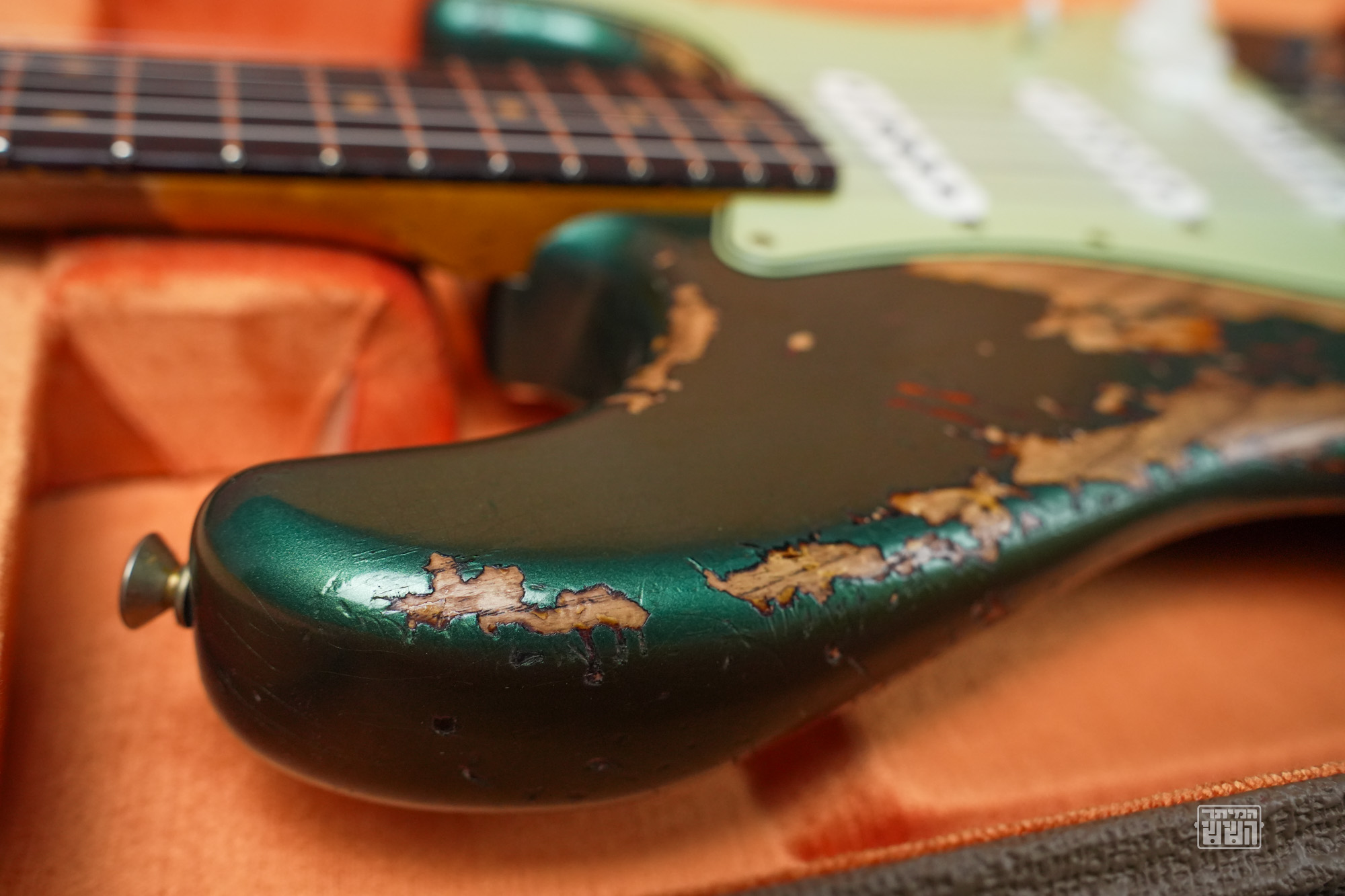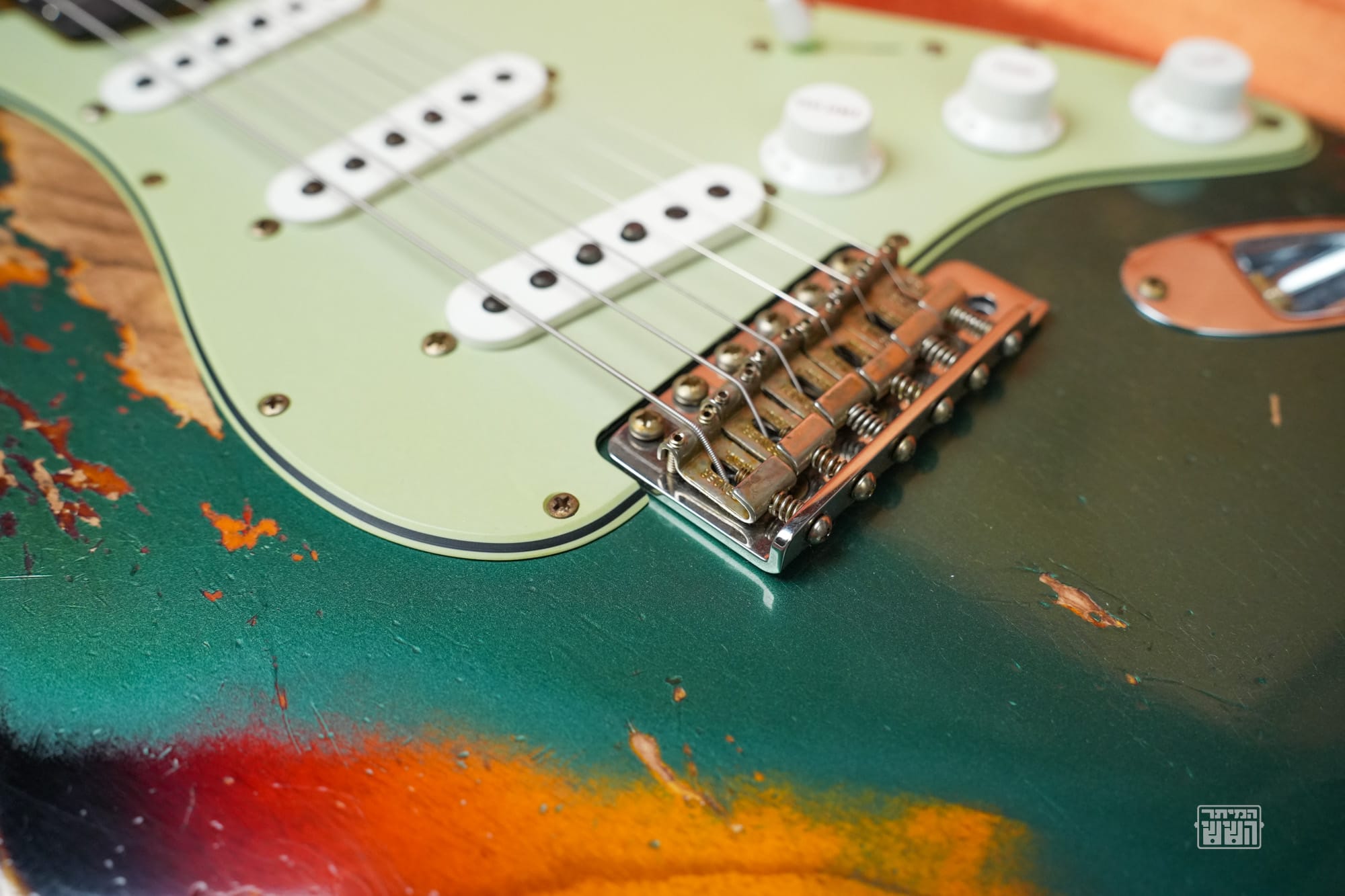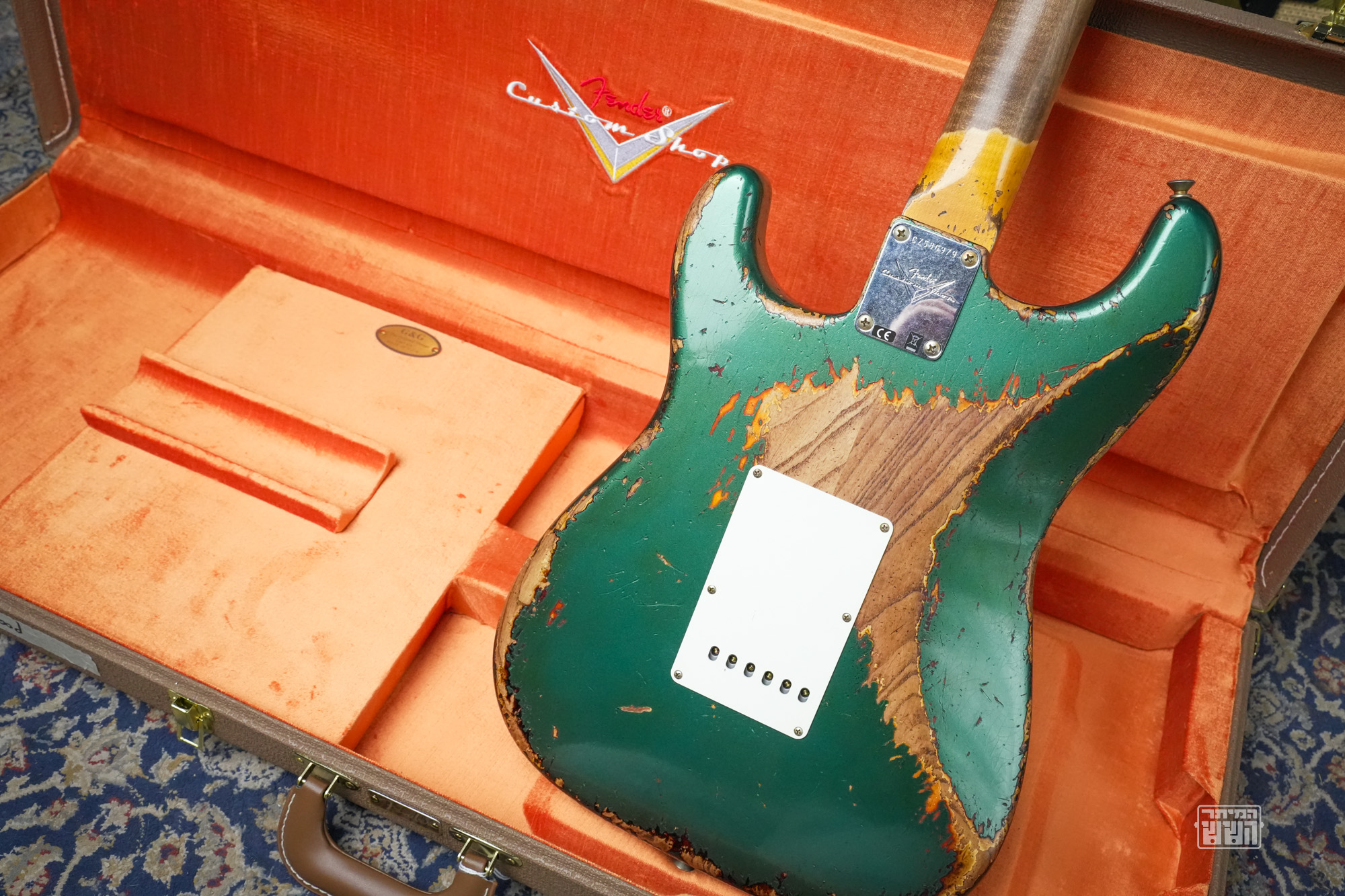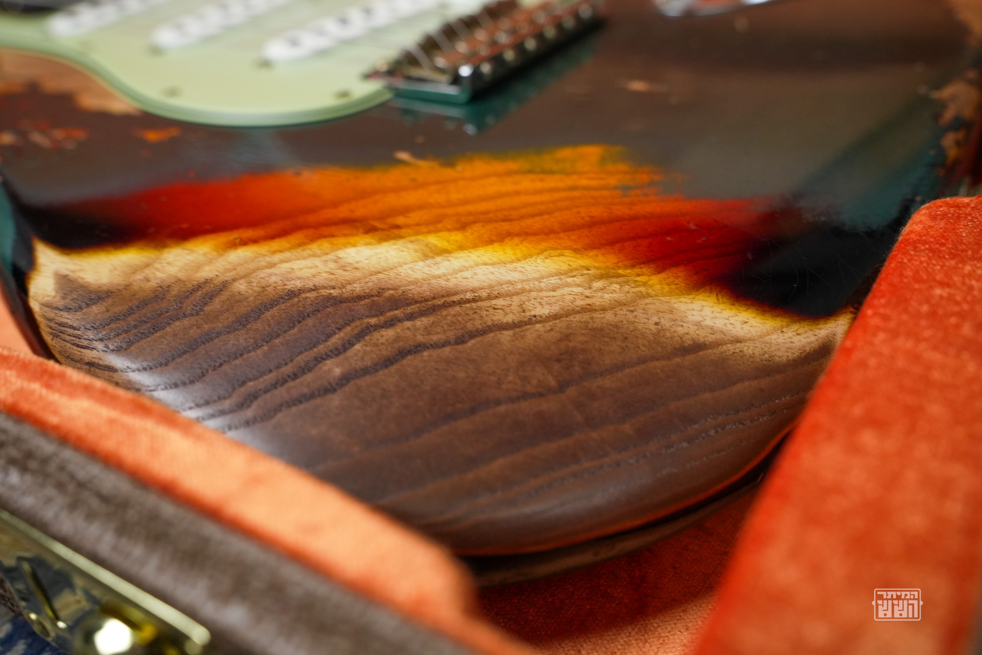 הסטראט הזו היא ראישיו 61 עם גימור ירוק שרווד מטאלי -אחד מגימורי הקאסטום המיוחדים שפנדר הציעו בזמנו – צבוע על גביי סאנברסט (צבע על צבע).