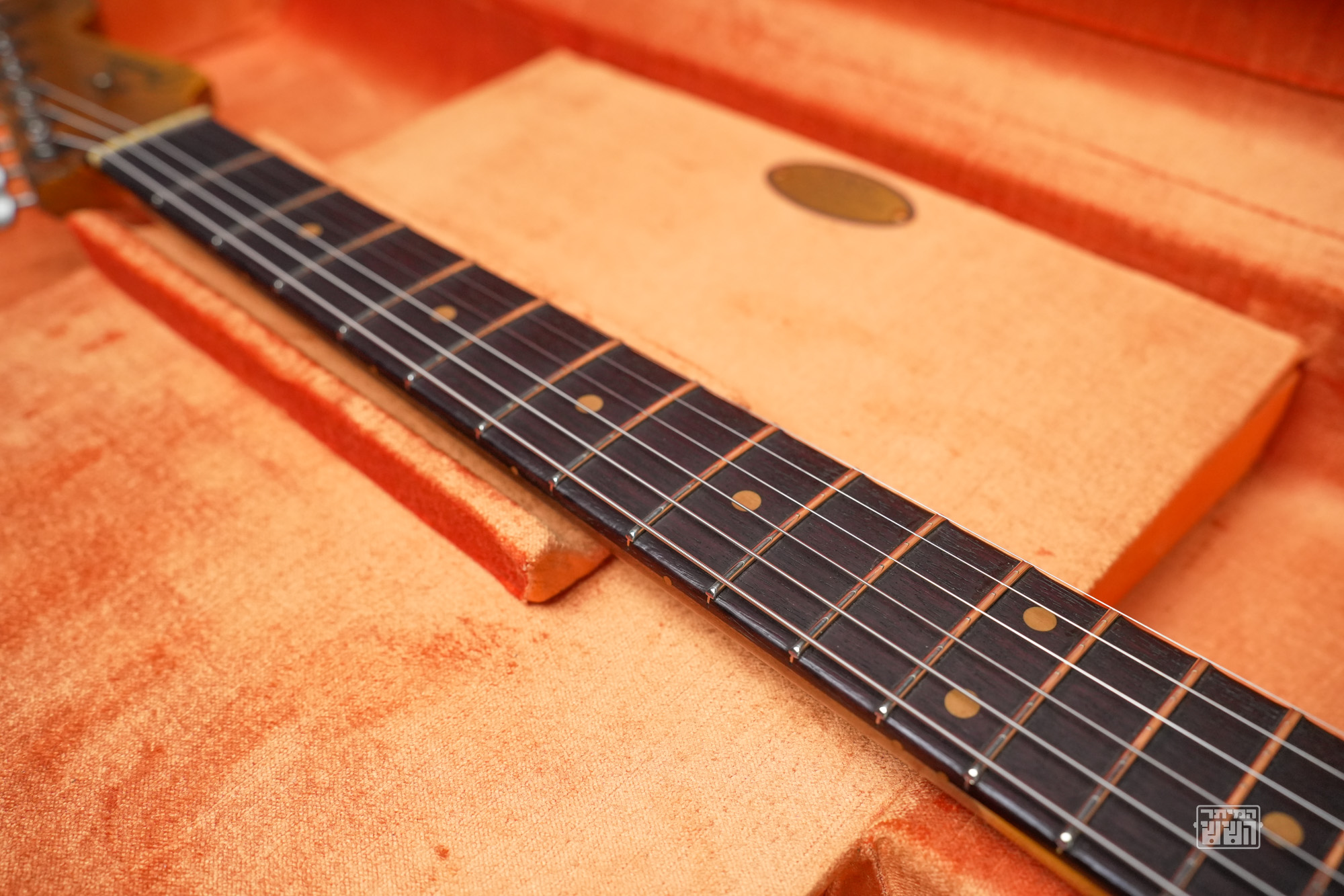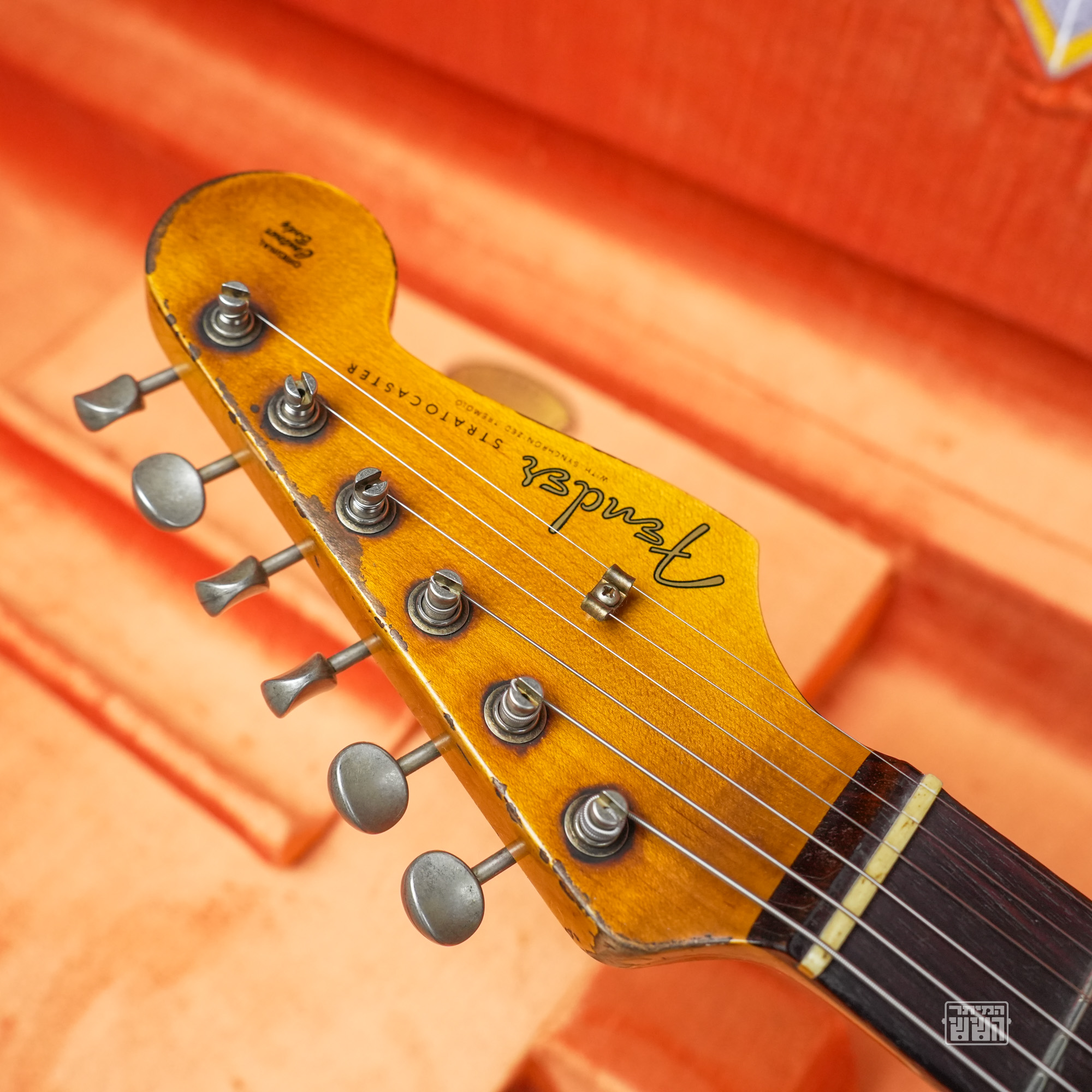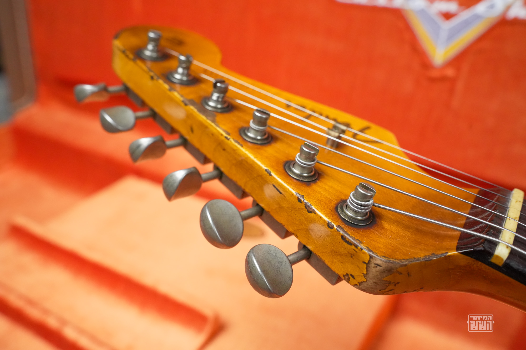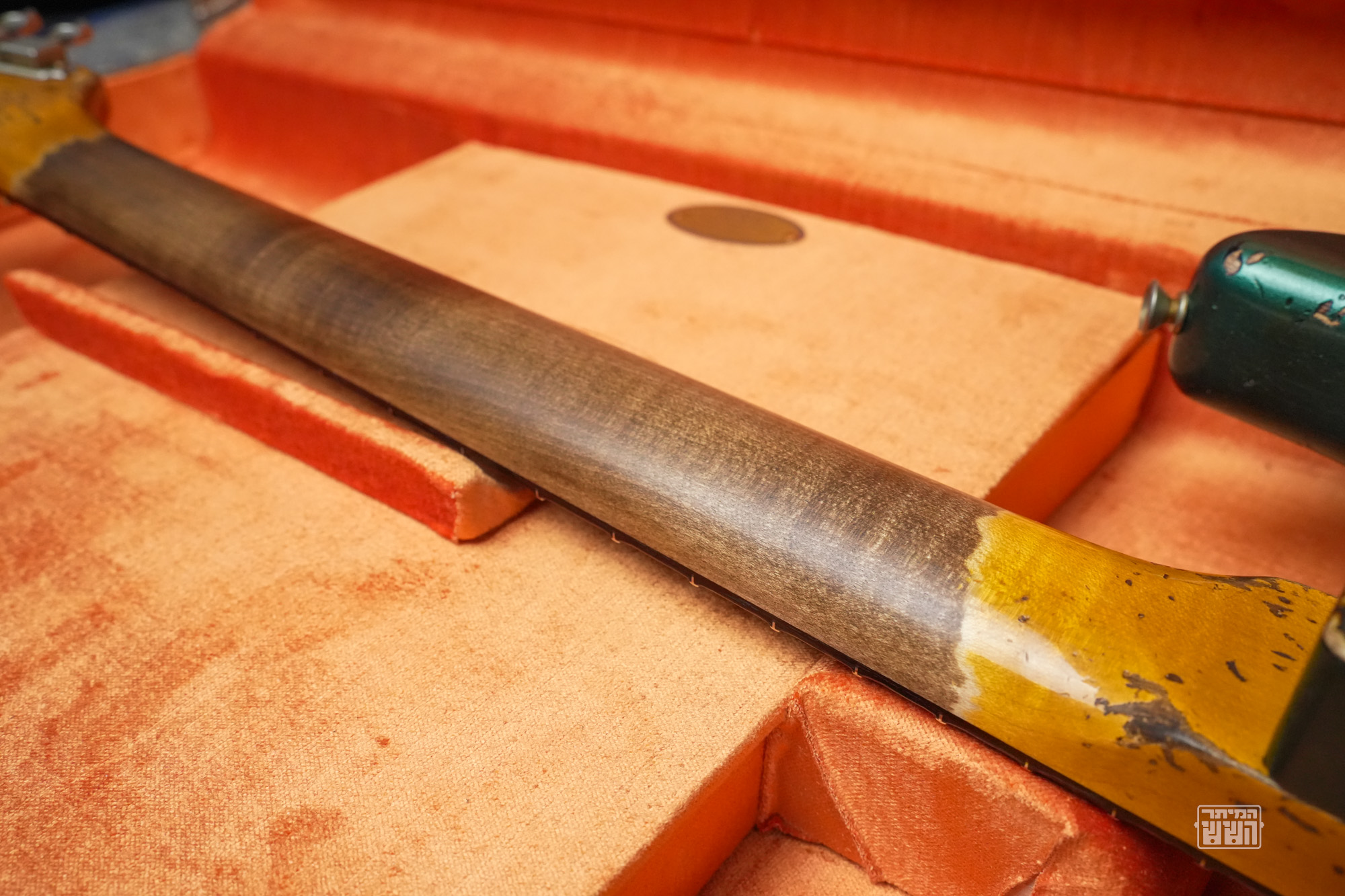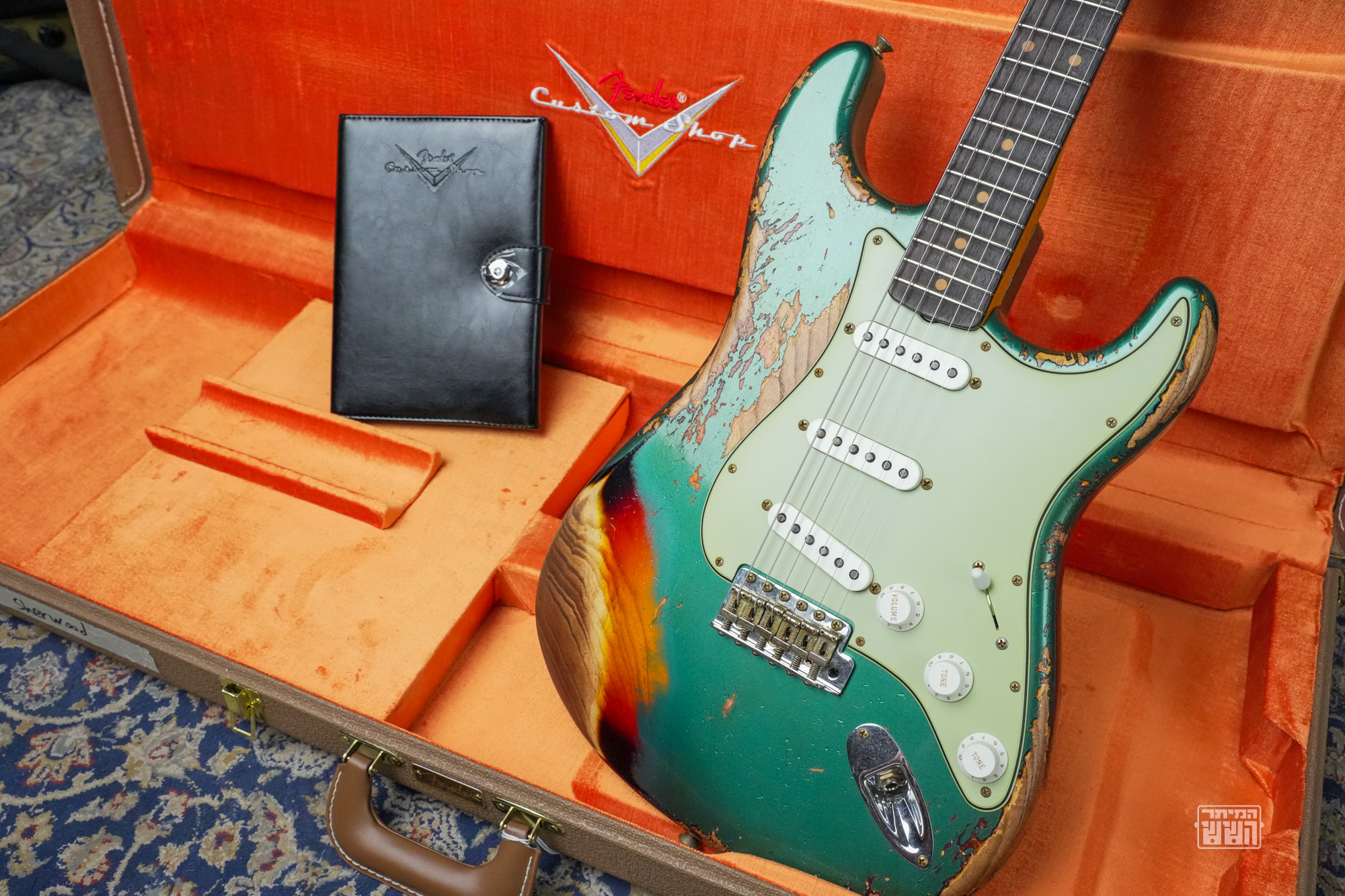 הסטראט הזו היא ראישיו 61 עם גימור ירוק שרווד מטאלי -אחד מגימורי הקאסטום המיוחדים שפנדר הציעו בזמנו – צבוע על גביי סאנברסט (צבע על צבע).