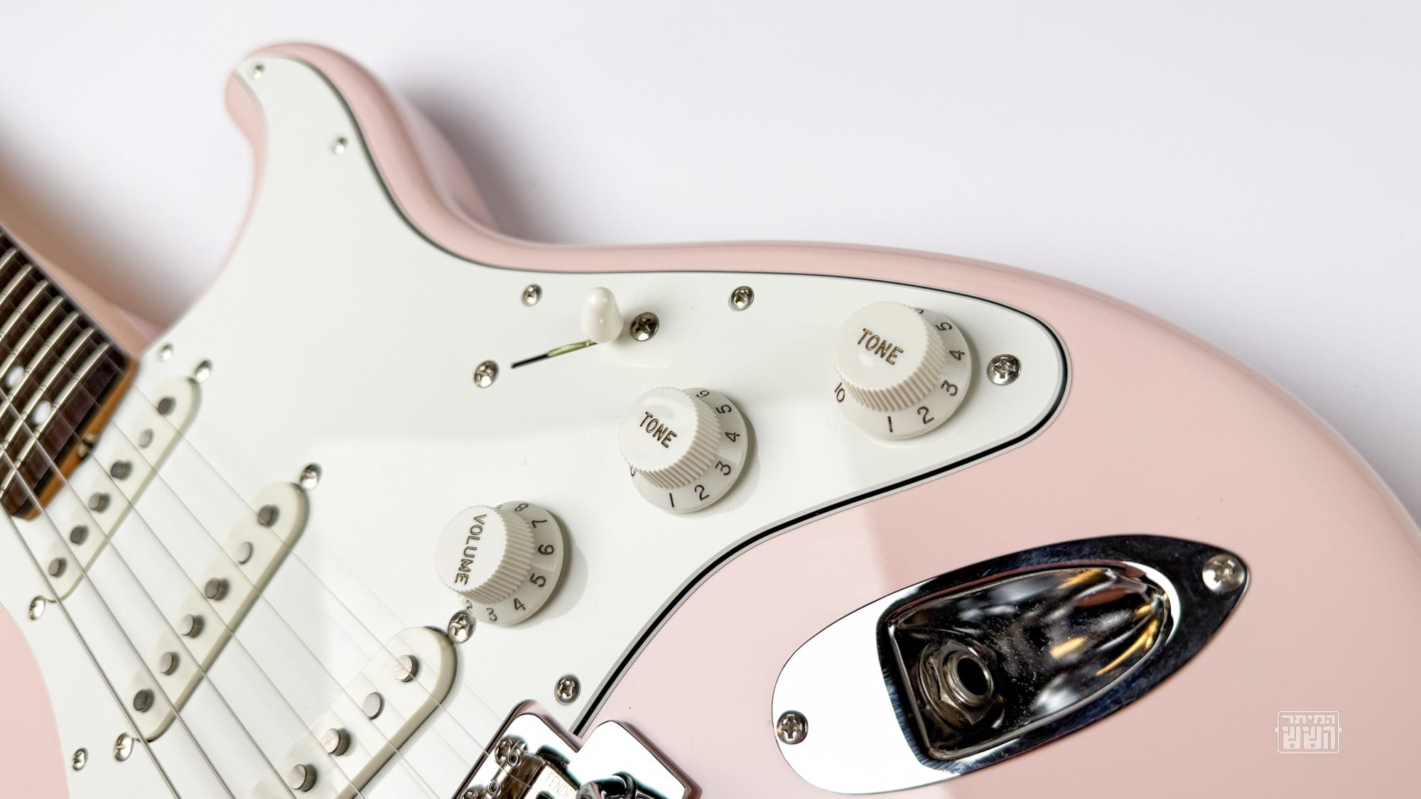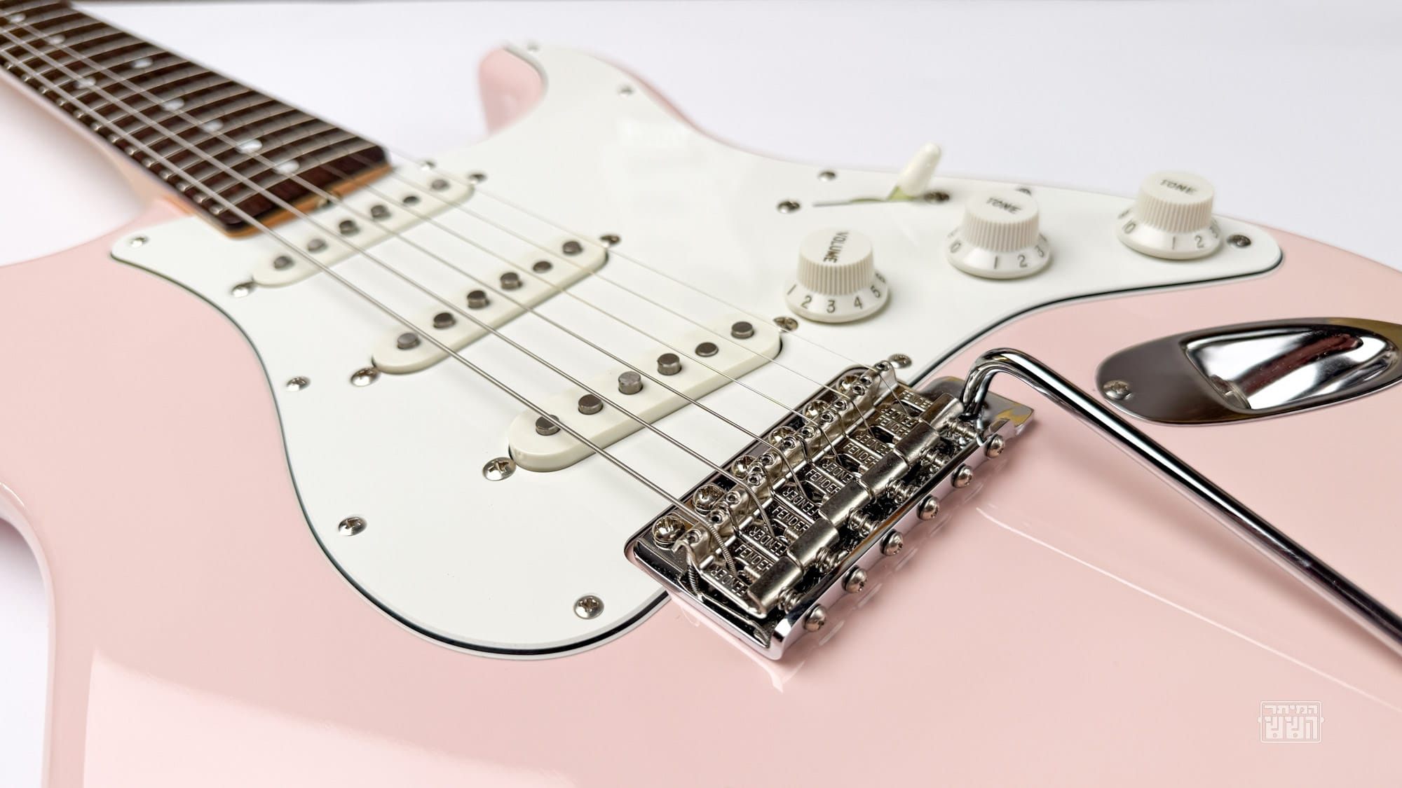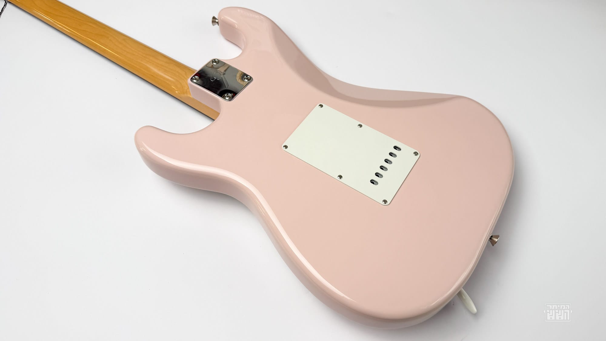 סטראט יפנית (יד שנייה) מסדרת ה-Traditional – שחזור של גיטרה משנות ה-60 המאוחרות (הדסטוק גדול) בצבע Shell Pink פסטלי ועדין – גרסת Fender Special Run בייצור ספציפי לחנויות יפניות