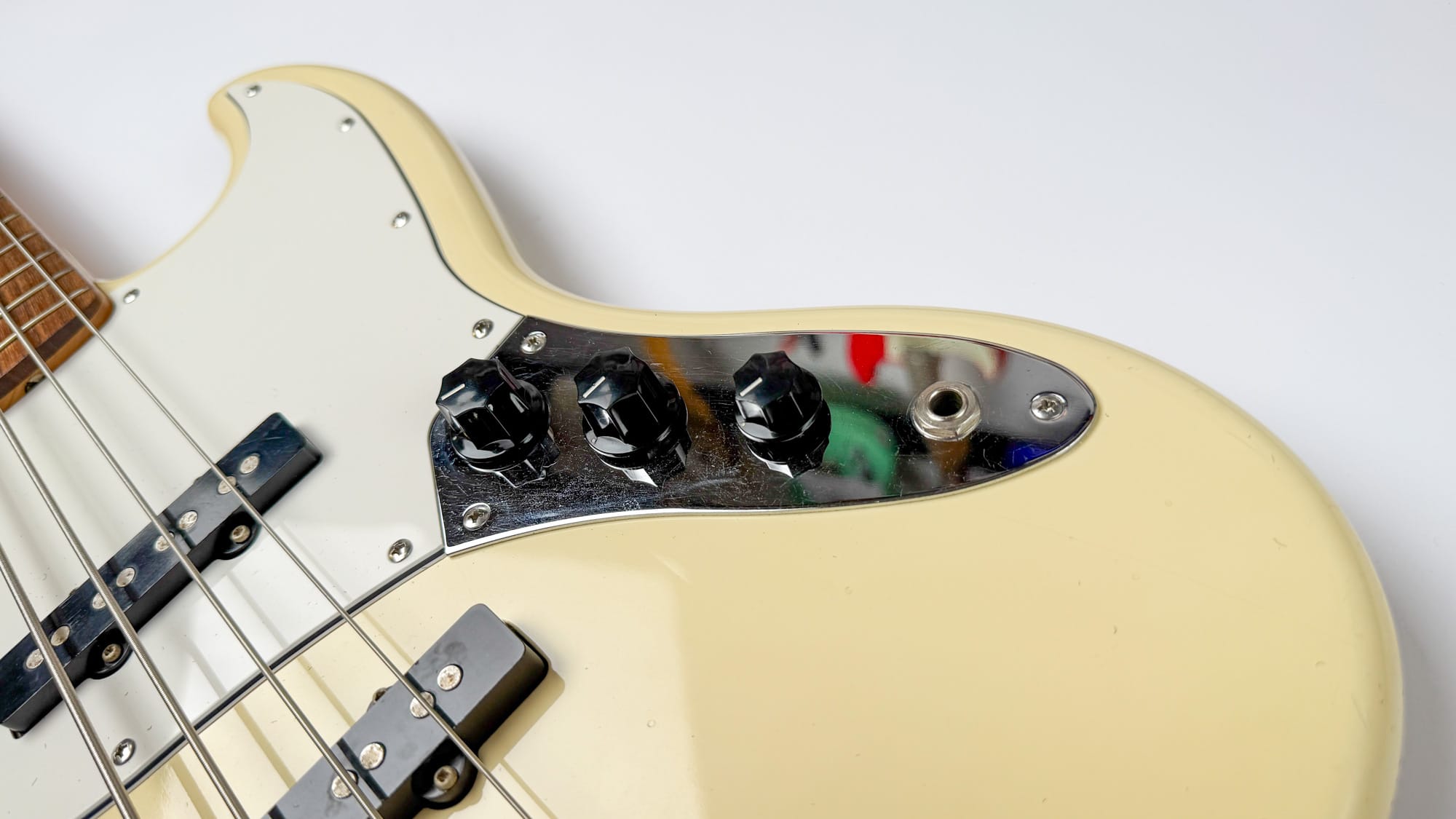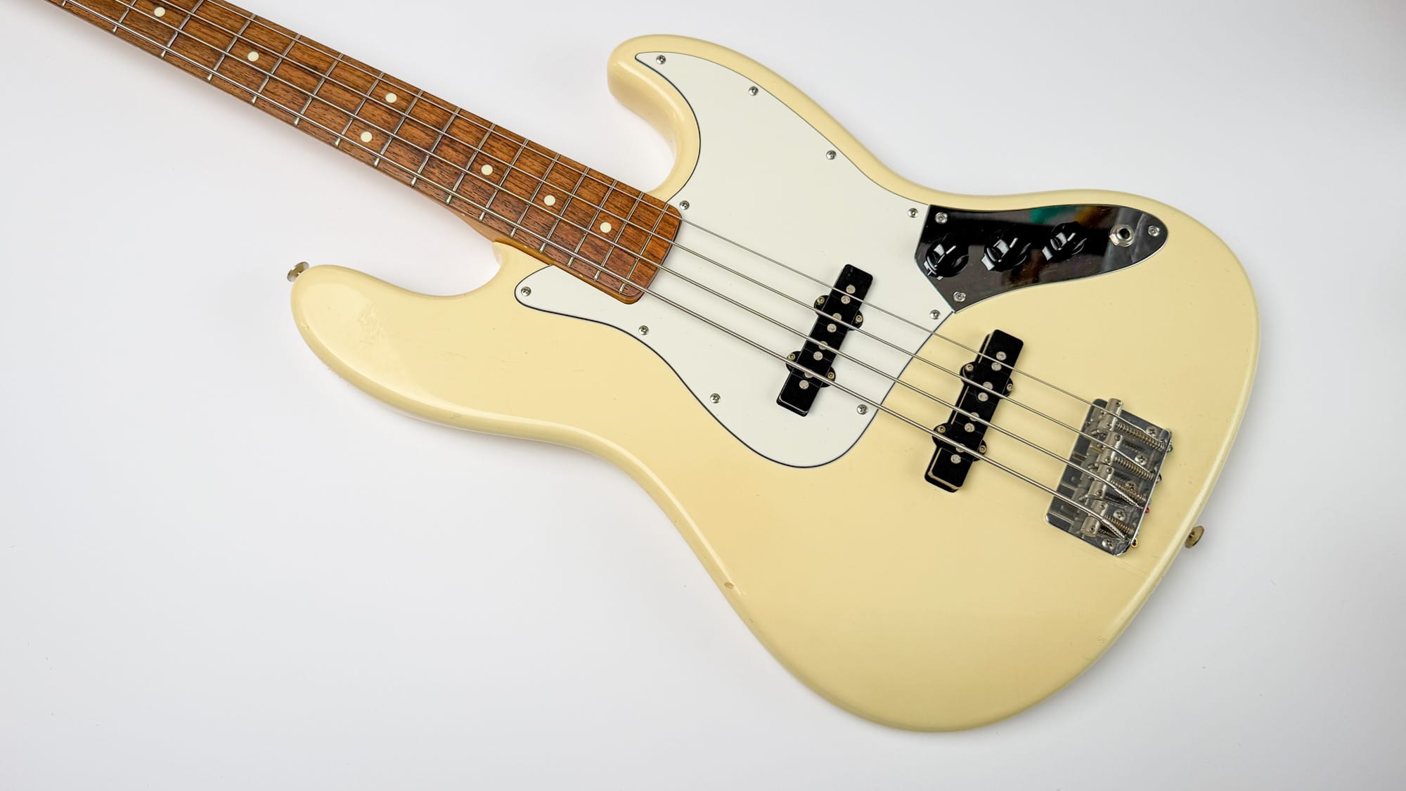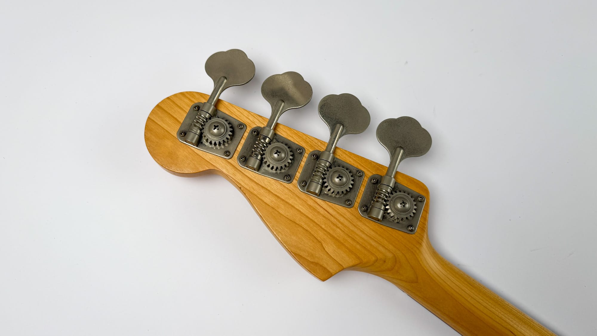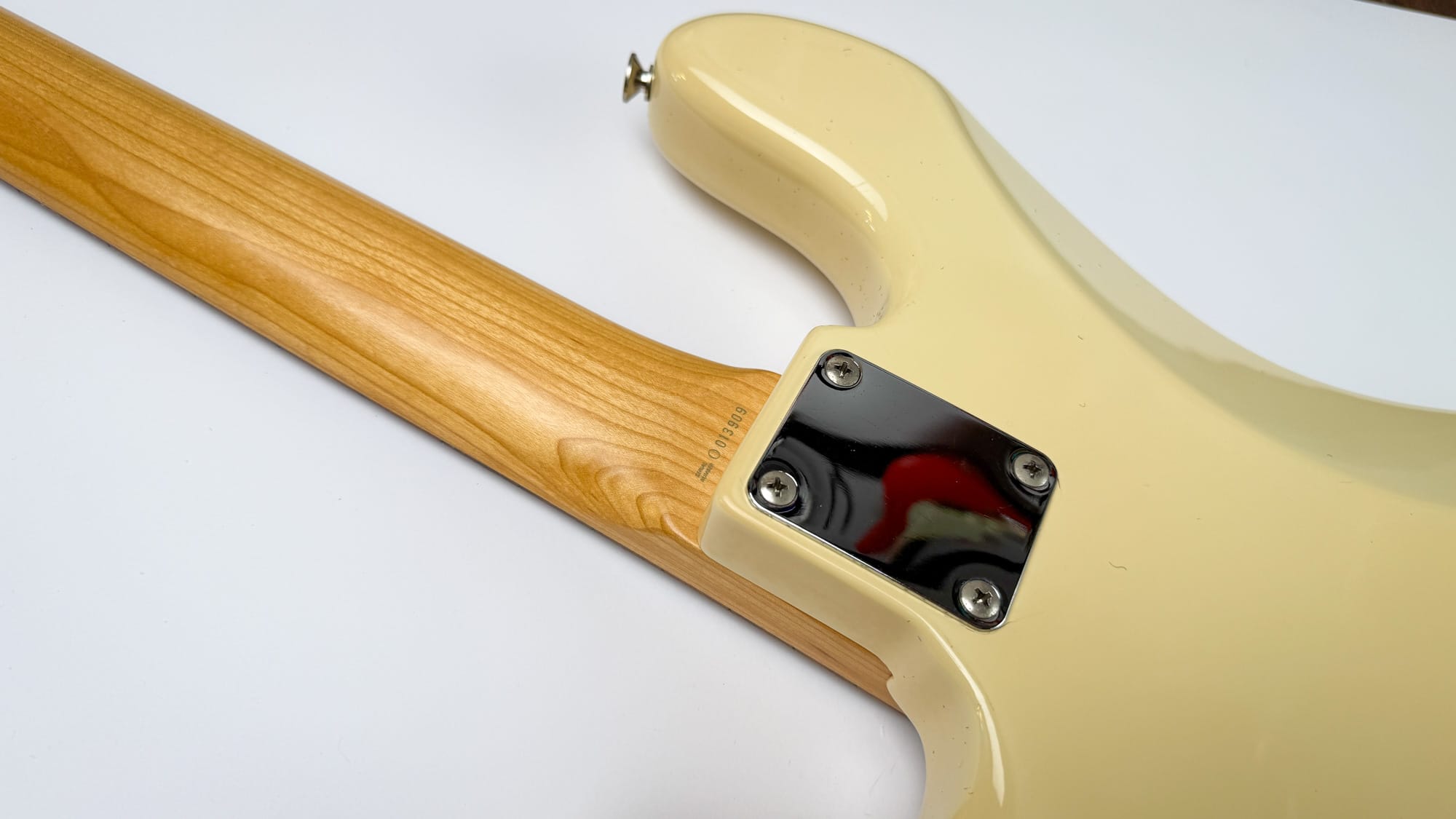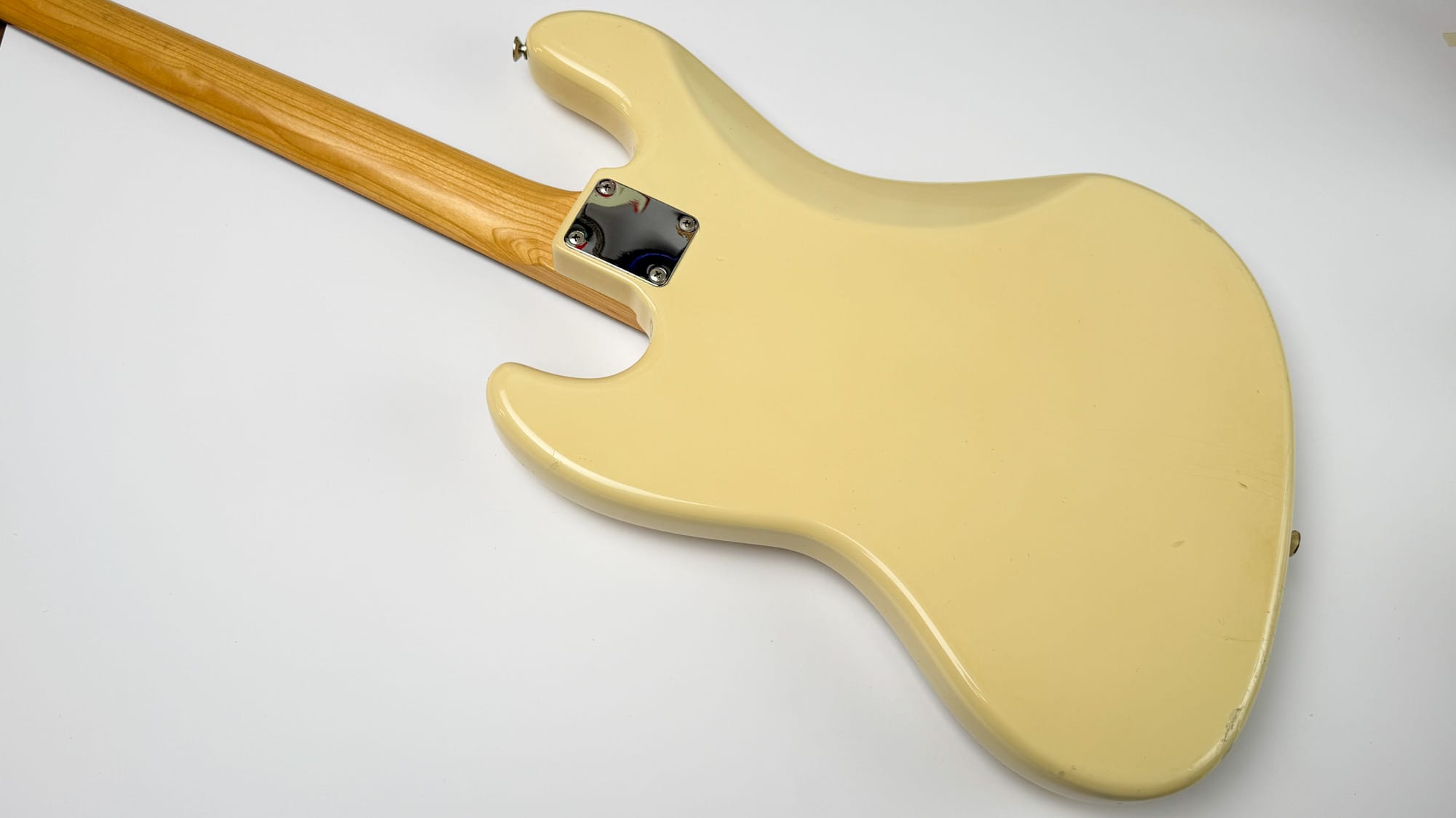 ג׳אז בס יד שנייה מבית פנדר יפן, ריאשיו שנות ה-60י עם גימור בצבע לבן וינטג׳י.