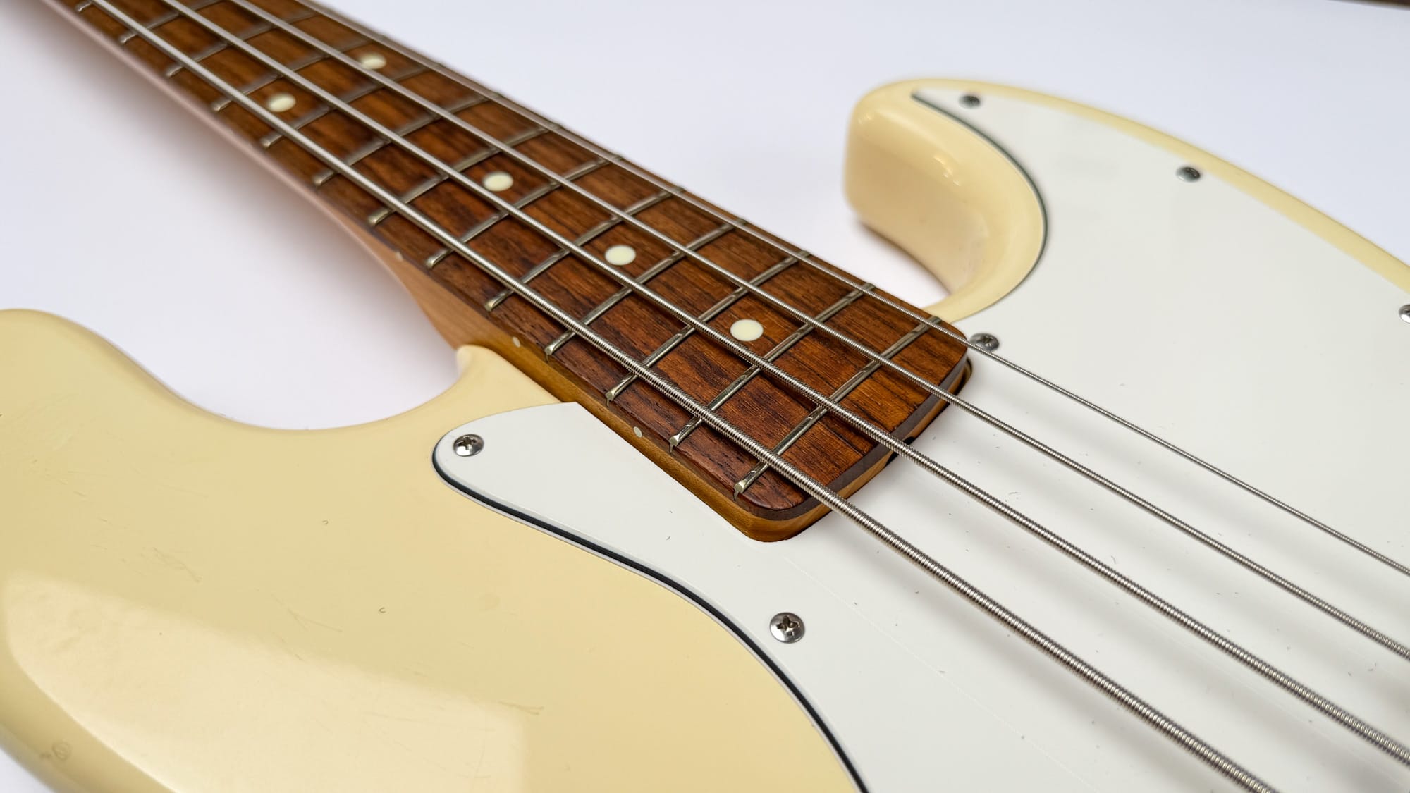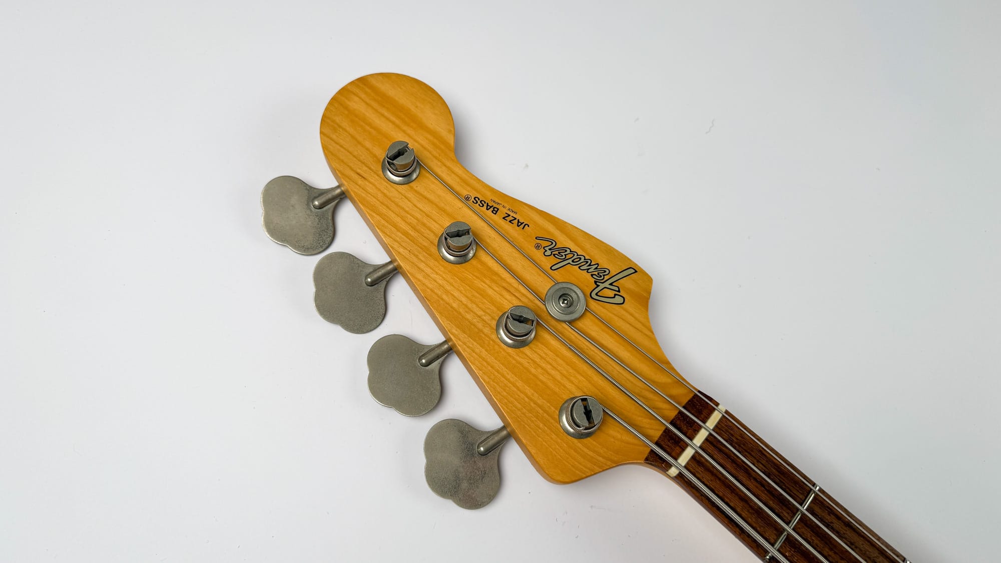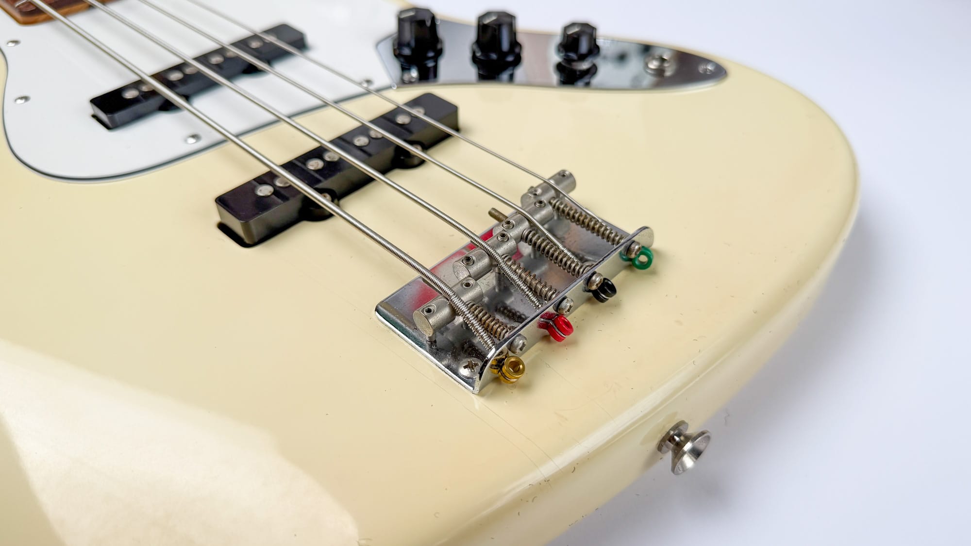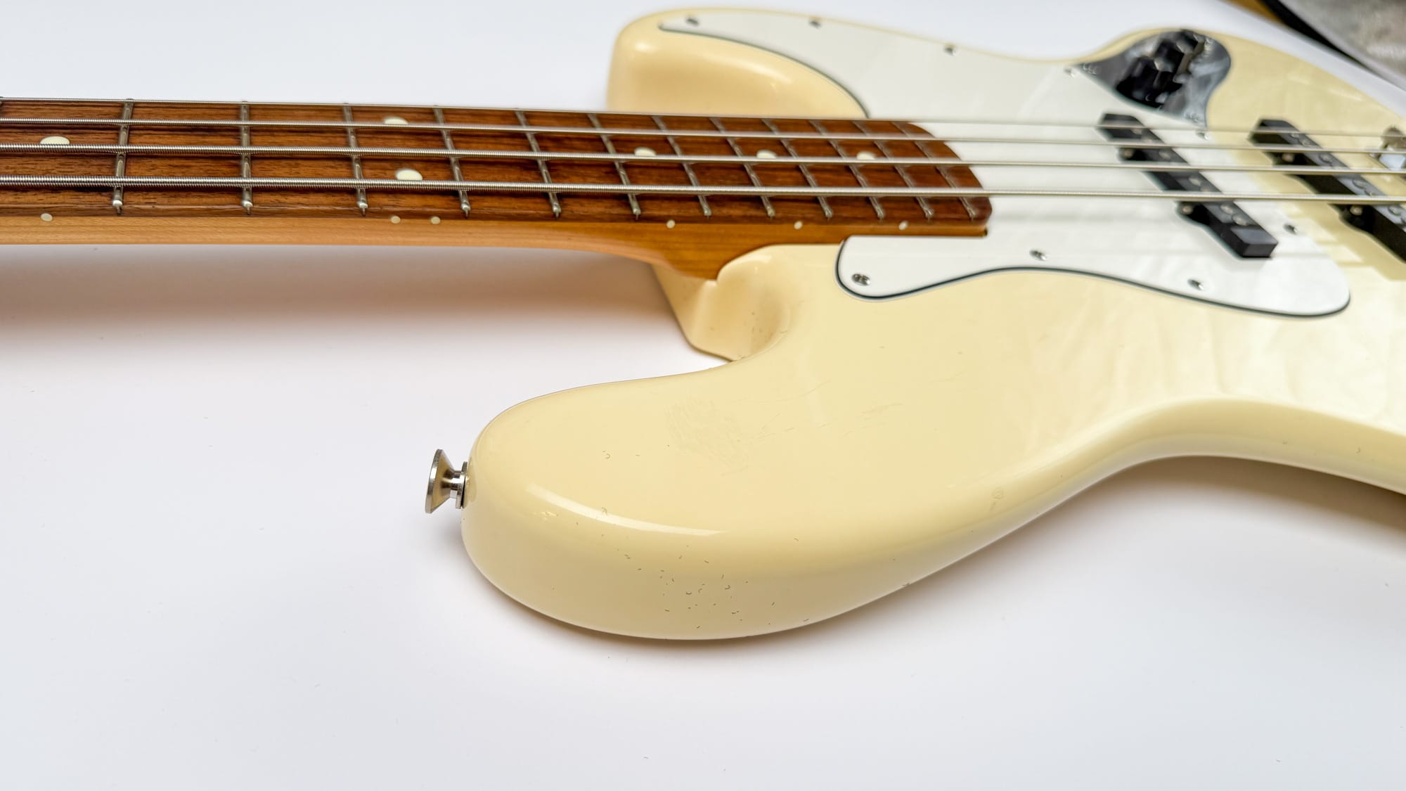 ג׳אז בס יד שנייה מבית פנדר יפן, ריאשיו שנות ה-60י עם גימור בצבע לבן וינטג׳י.