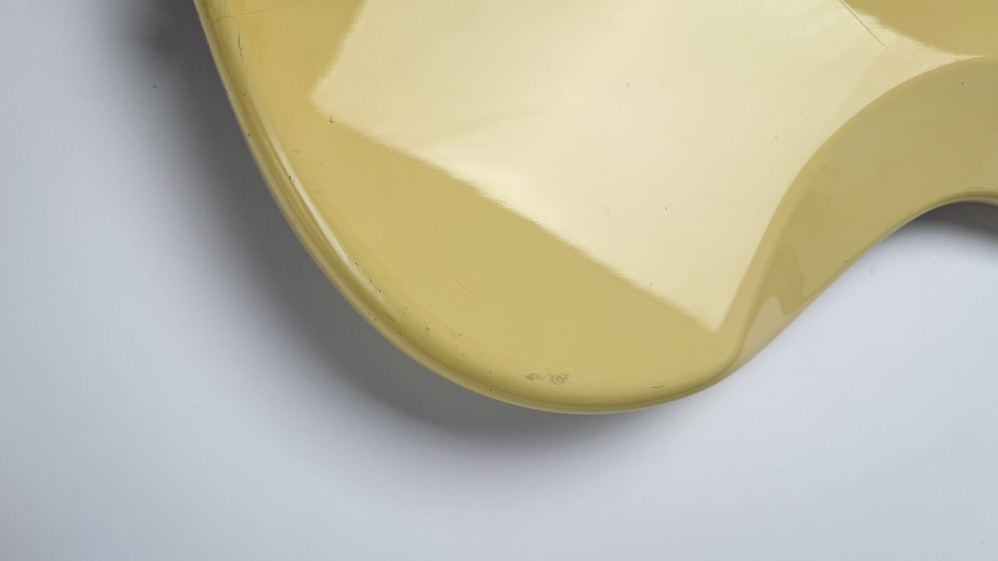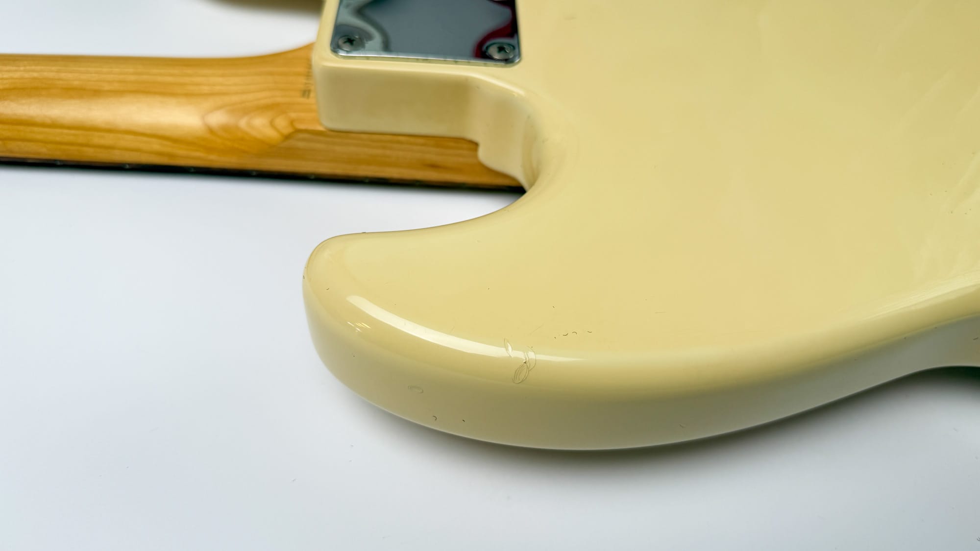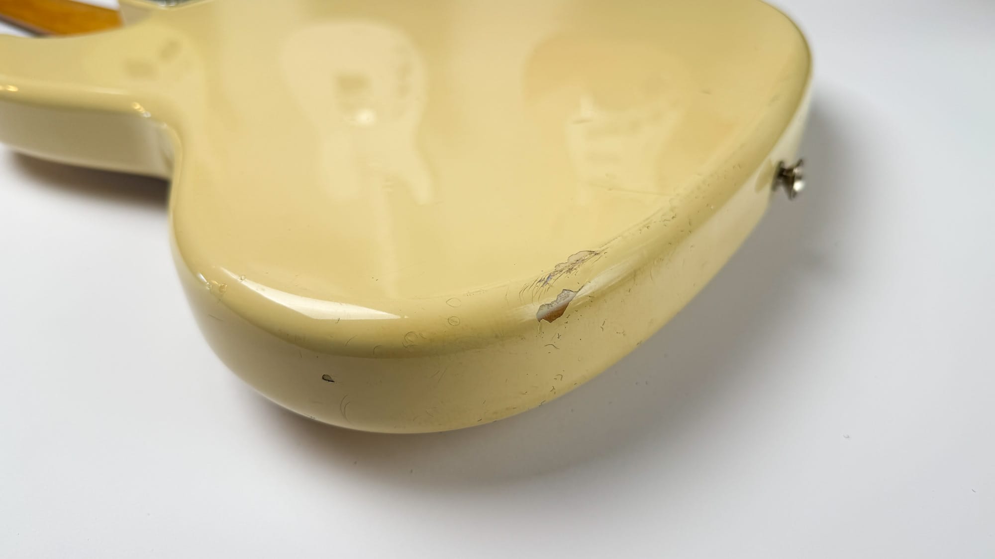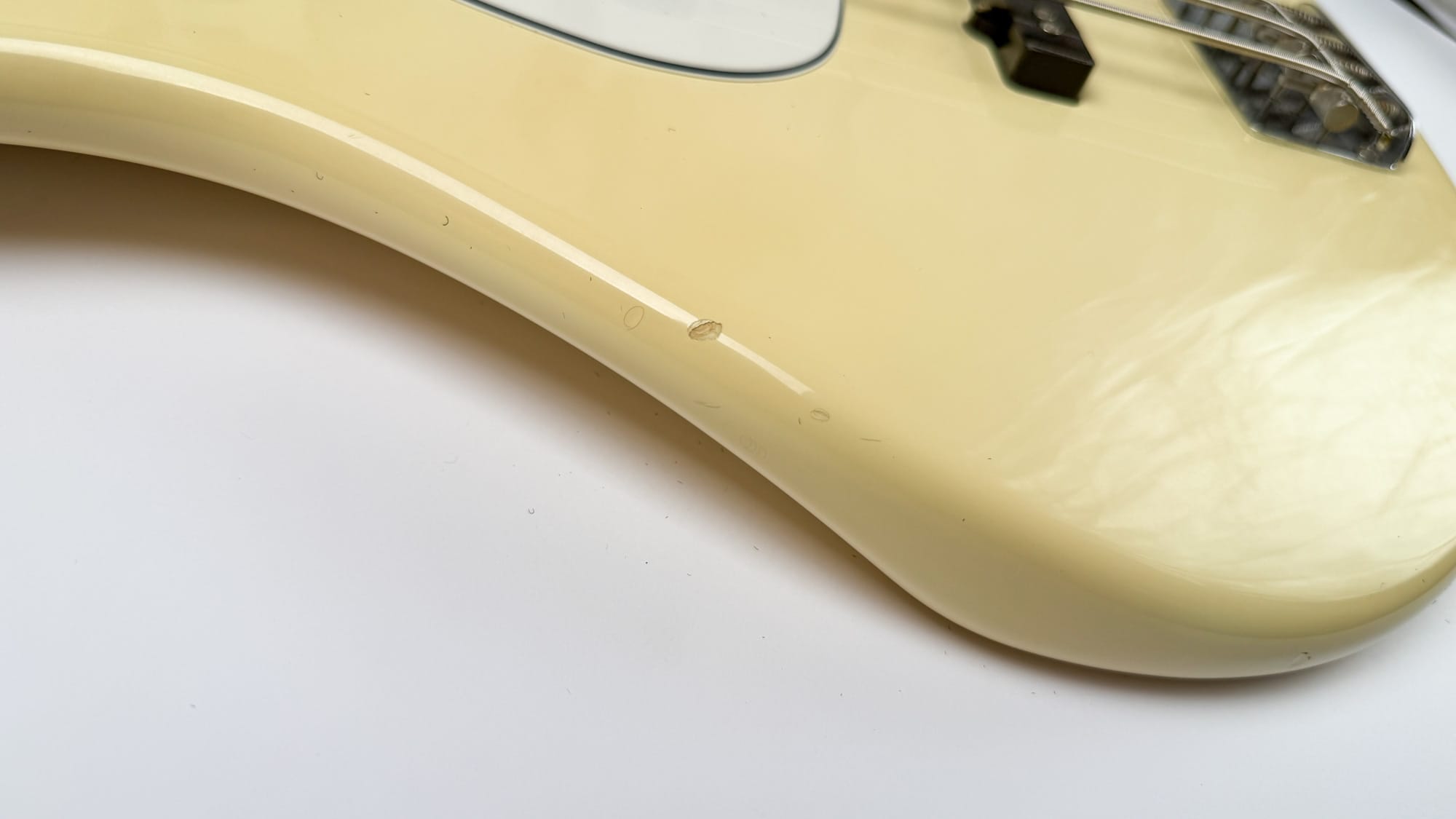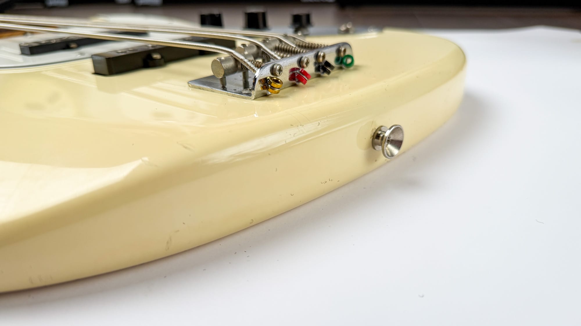 ג׳אז בס יד שנייה מבית פנדר יפן, ריאשיו שנות ה-60י עם גימור בצבע לבן וינטג׳י.