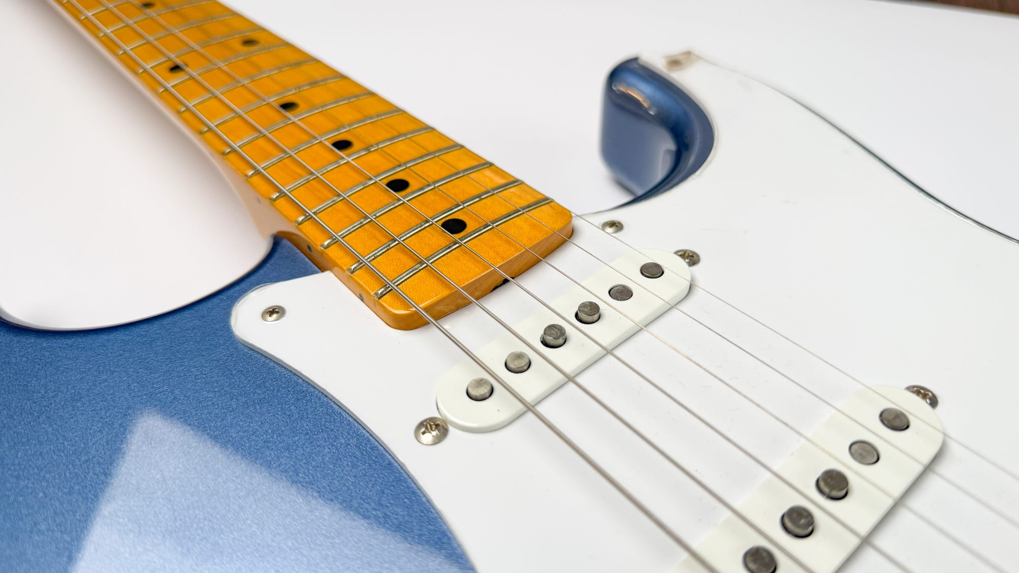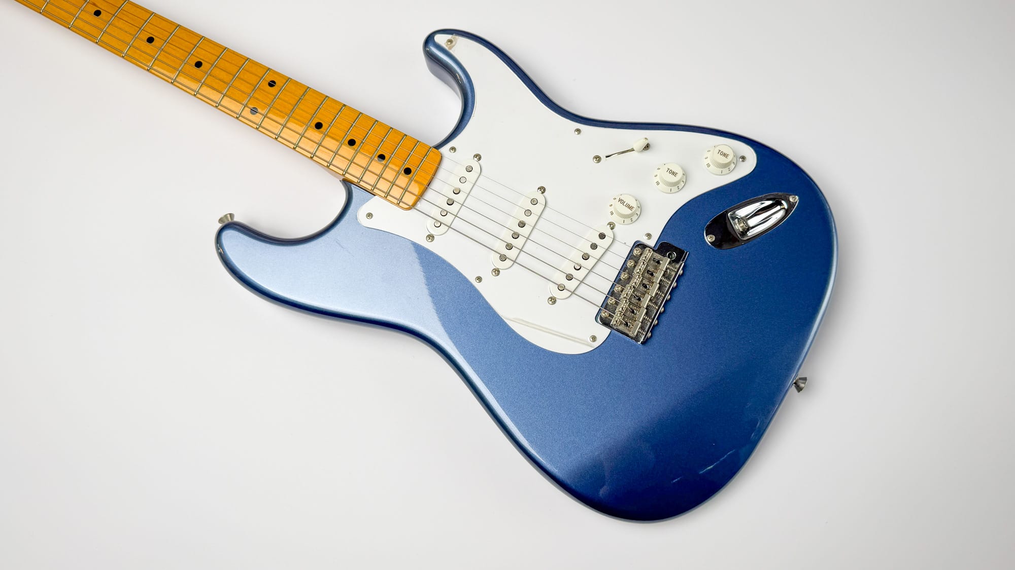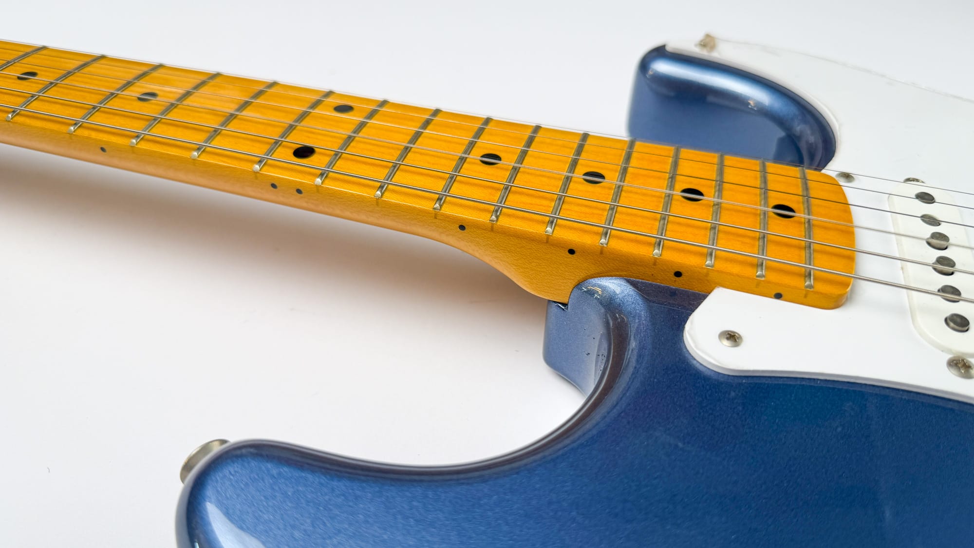 סטראט ריאשיו 57 יפנית שמגיעה עם פיקאפי Texas Special (אמריקאיים!) מהמפעל, בגימור Old Lake Placid Blue.