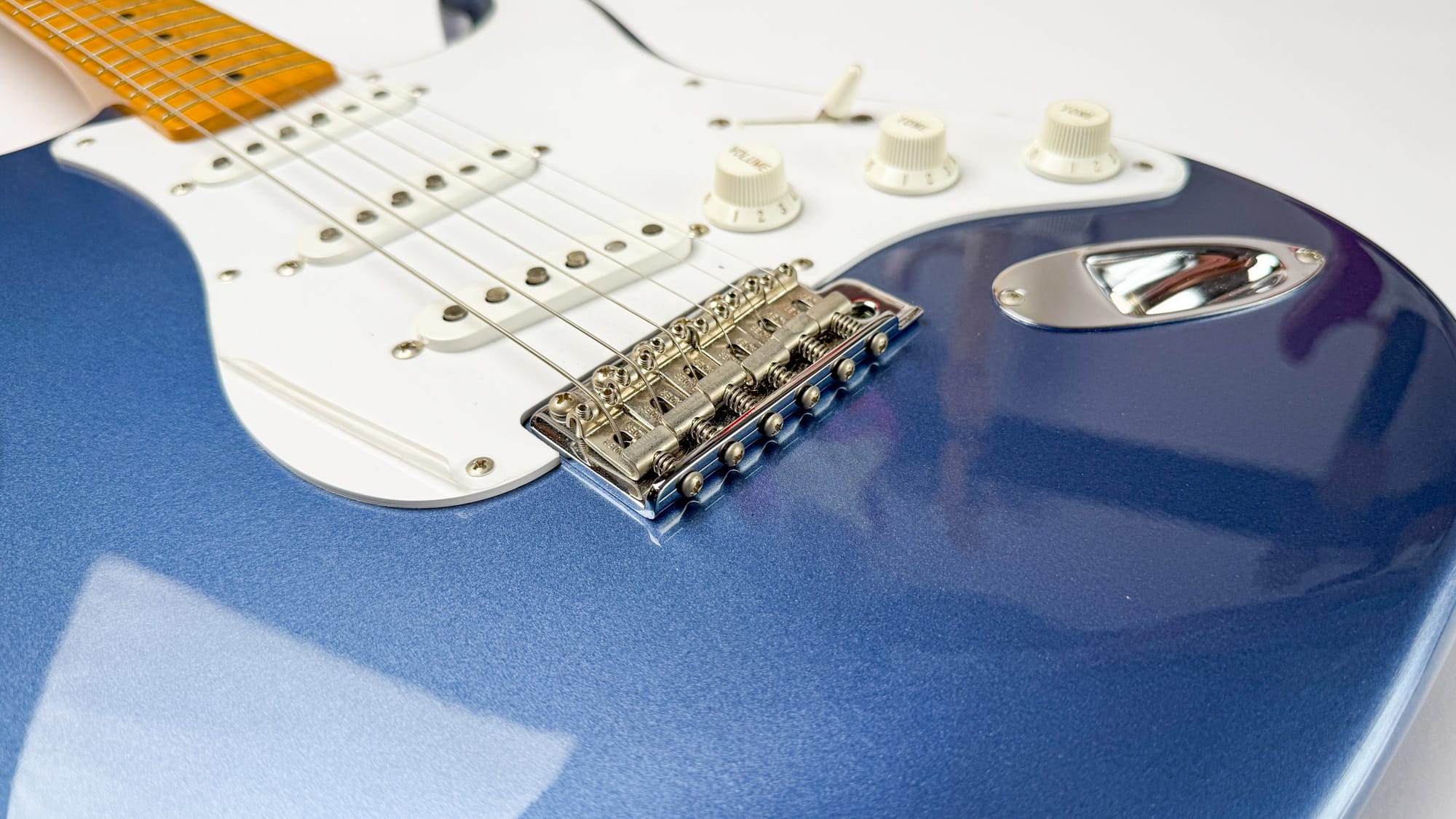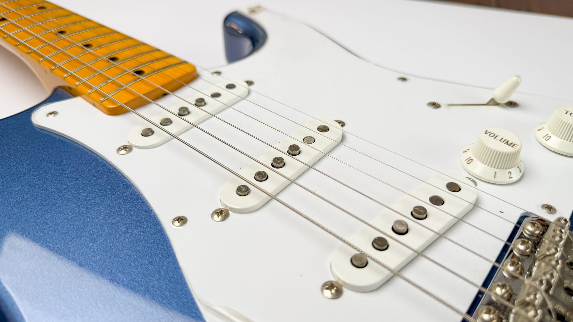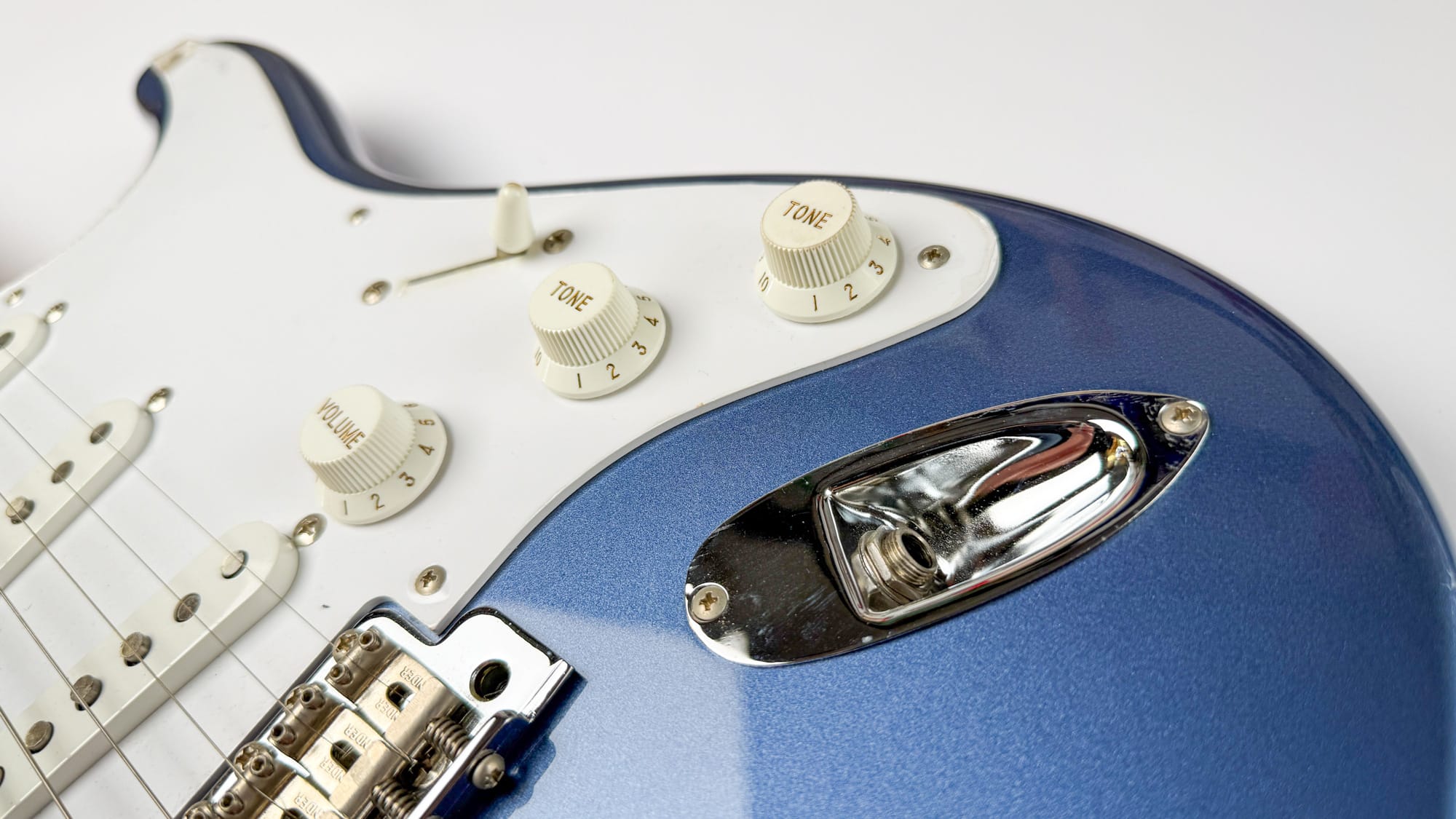 סטראט ריאשיו 57 יפנית שמגיעה עם פיקאפי Texas Special (אמריקאיים!) מהמפעל, בגימור Old Lake Placid Blue.