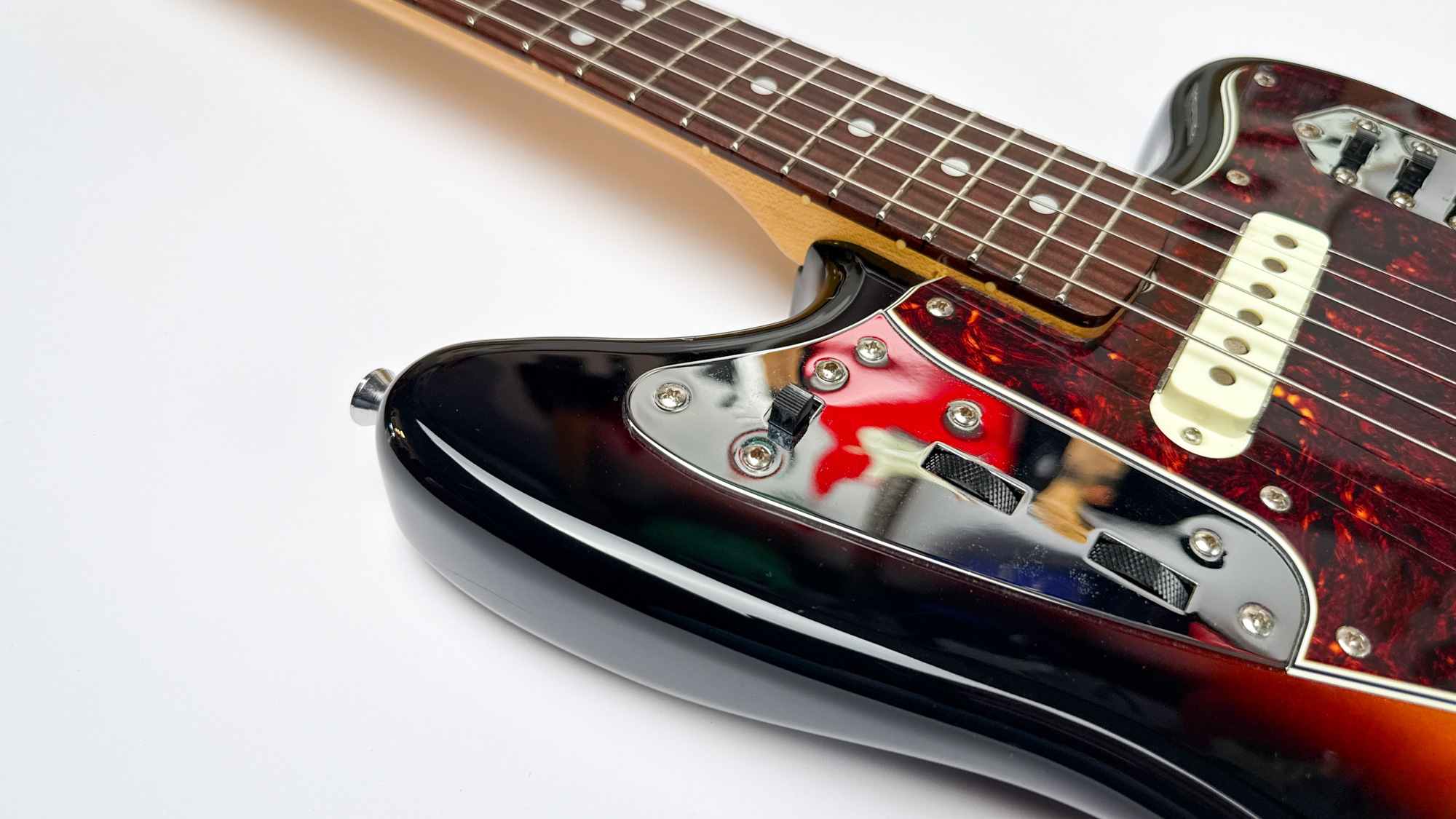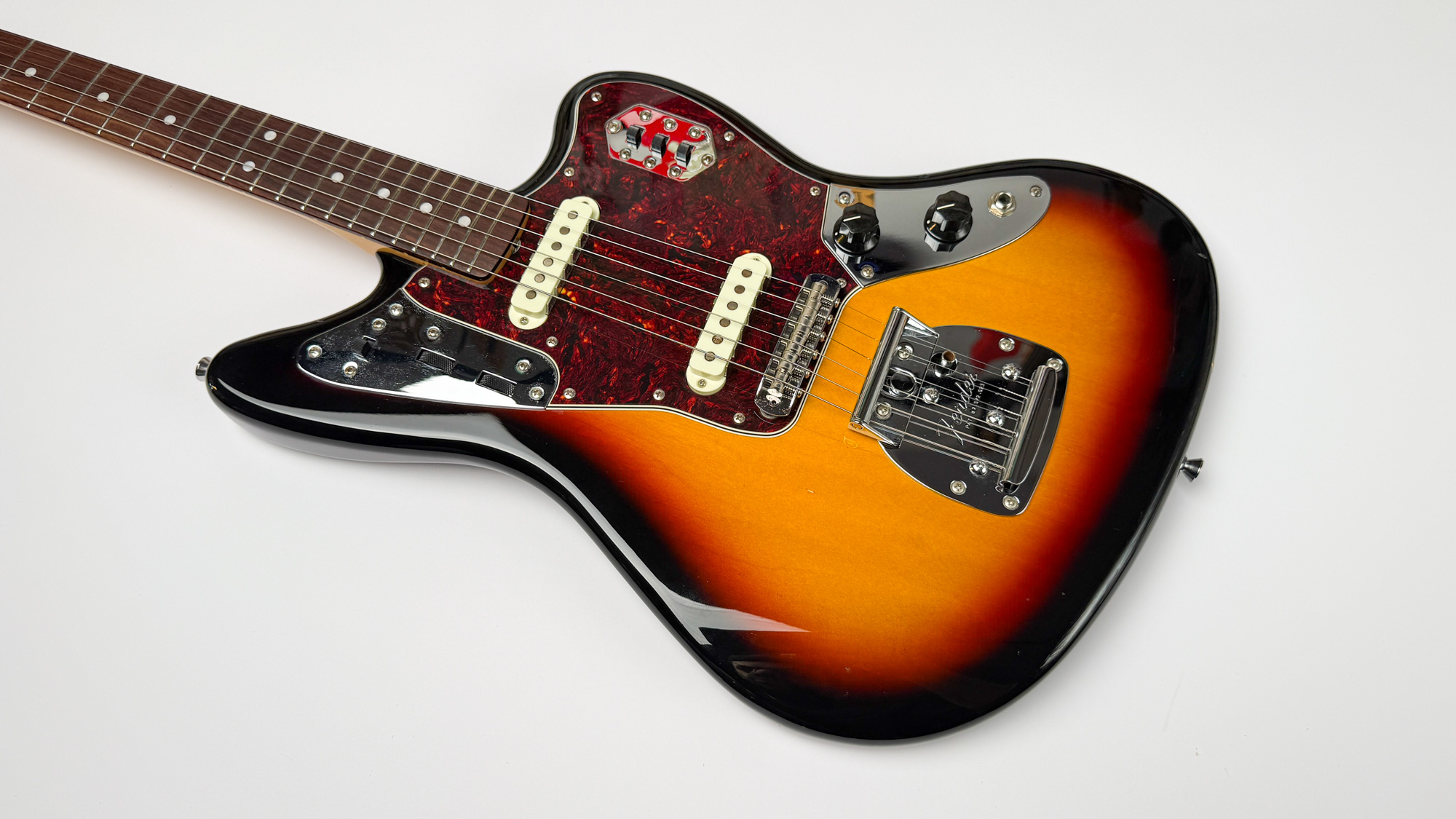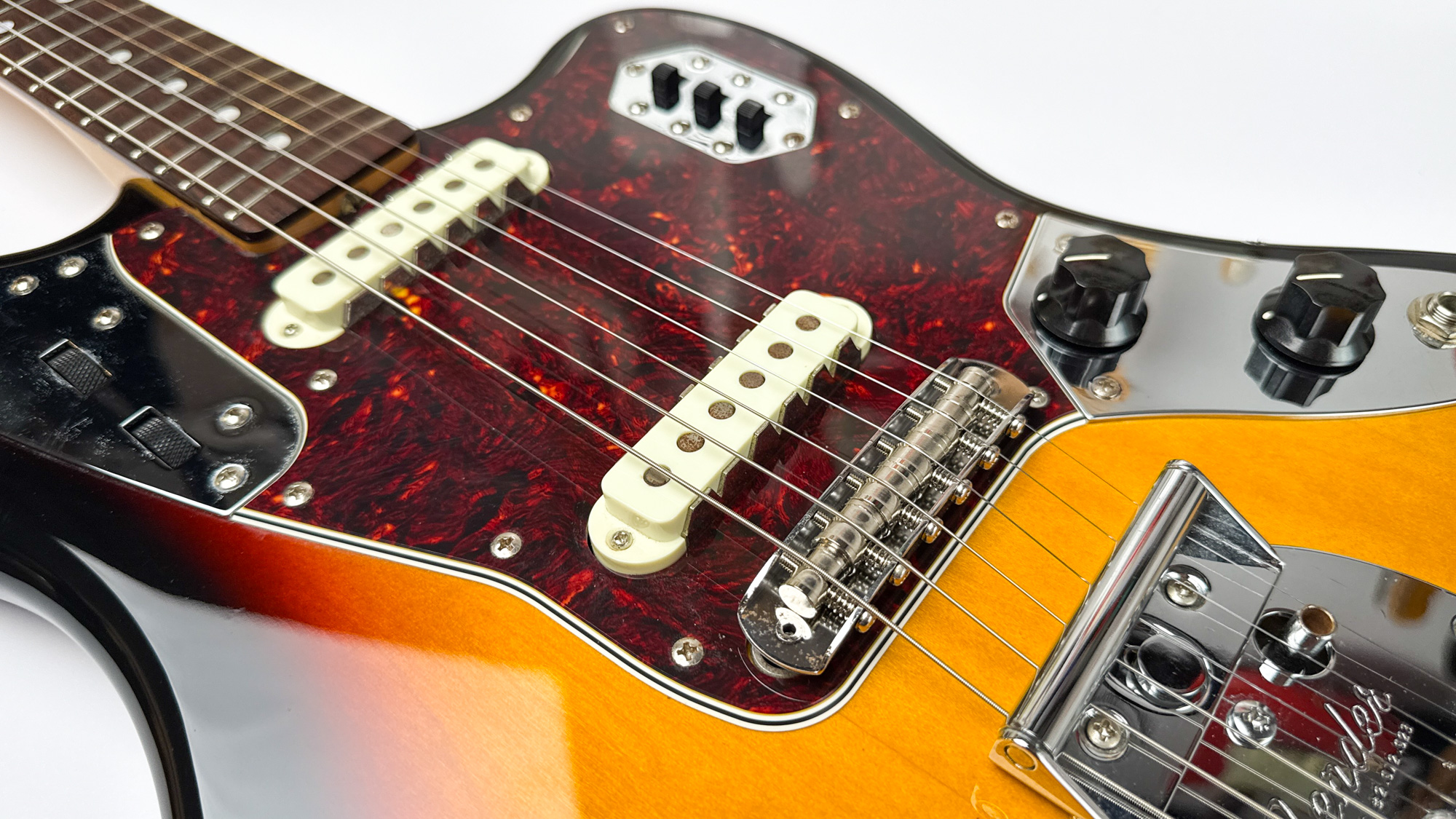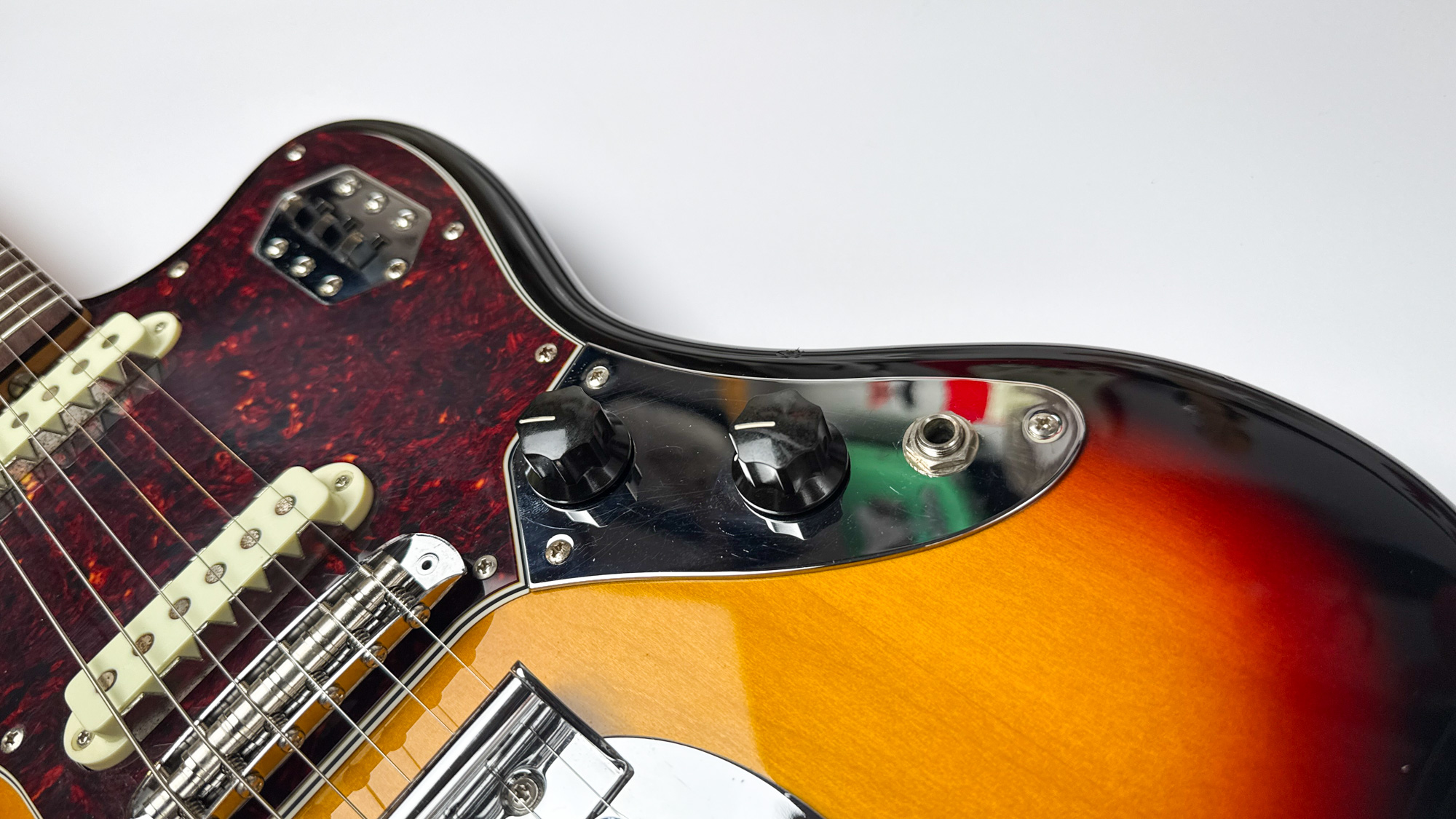 גיטרה יד שנייה – ראישיu ליגואר שנות ה-60 מבית פנדר יפן עם גימור סאנברסט קלאסי ופיקגארד שקשוקה.